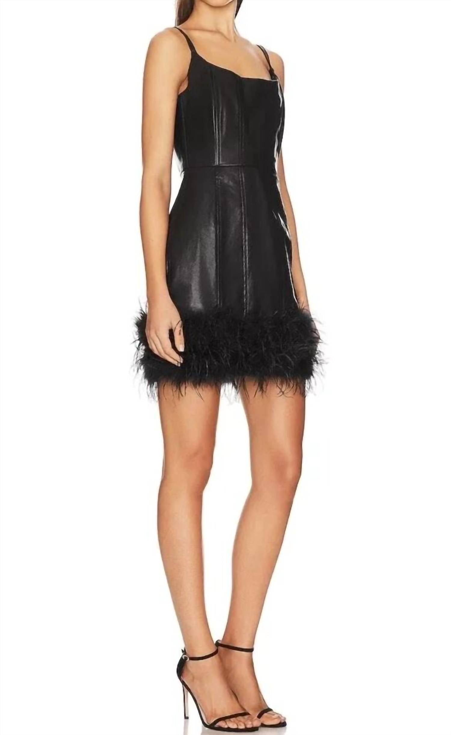 Свободное и элегантное платье, которое вы будете носить круглый год. Откройте для себя платье из искусственной кожи Line and Dot - шикарное мини-платье, идеально подходящее для эффектного образа в отпуске. Это черное платье сочетает в себе однотонный тренд с игривой отделкой из перьев и регулируемыми тонкими бретельками. Платье имеет А-силуэт с круглым вырезом и выполнено из гладкой искусственной кожи, идеально подходящий для весенних праздников. Оцените его непринужденное очарование и дополните свой гардероб этой современной вещью.