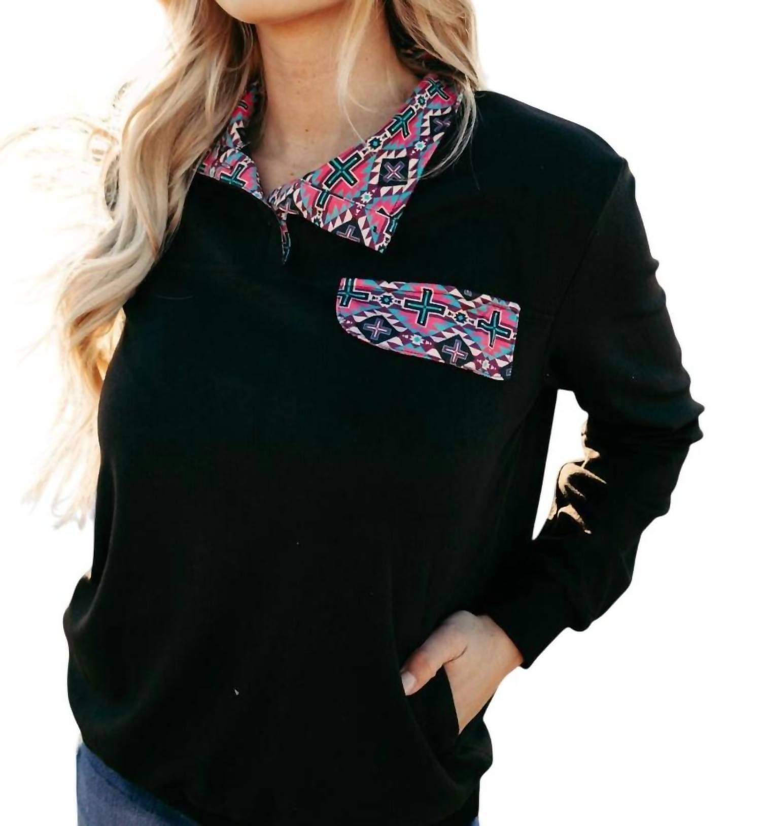 Откройте для себя топ-пуловер Midnight Orchid от Sterling Kreek - стильный выбор с характерным ацтекским воротником, который украсит ваш зимний гардероб. Этот черный топ с V-образным вырезом изготовлен из мягкой смеси 32% хлопка, 56% вискозы и 12% спандекса, что обеспечивает комфорт и гибкость. Он оснащен удобными функциональными боковыми карманами и застежкой-липучкой для удобства надевания. Можно стирать в стиральной машине.