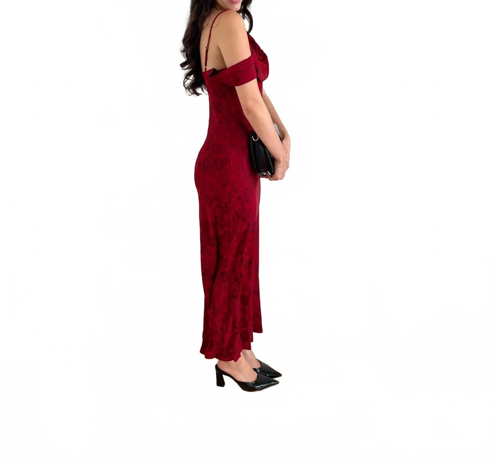 Платье макси Rouge Vine от LOST + WANDER - великолепное вечернее платье насыщенного красного цвета, созданное для элегантных весенних мероприятий. Это облегающее платье без рукавов с круглым вырезом и цветочным жаккардовым узором дополнено драпированным вырезом на плечах и боковым разрезом, что добавляет ему привлекательности. Несмотря на отсутствие карманов, оно прекрасно вписывается в тренд «тихой роскоши», воплощая изысканность и стиль.