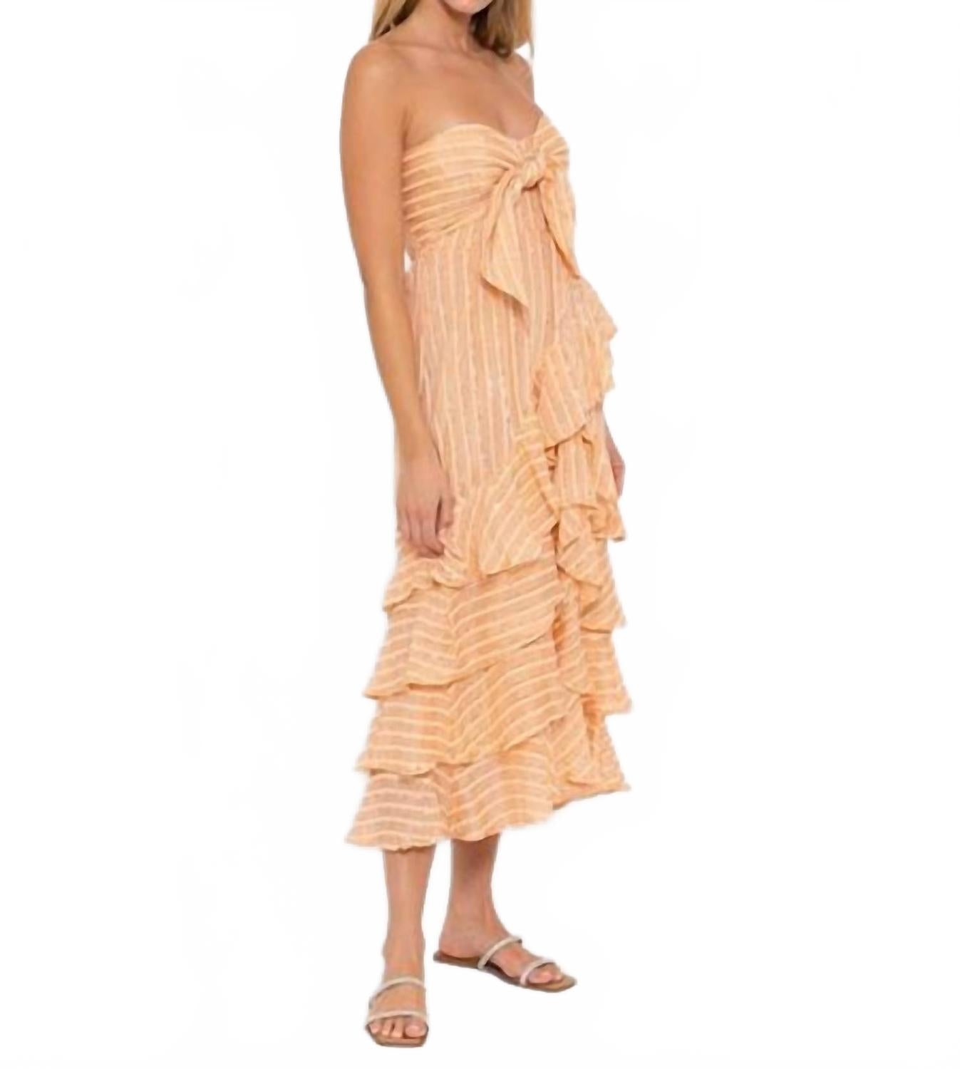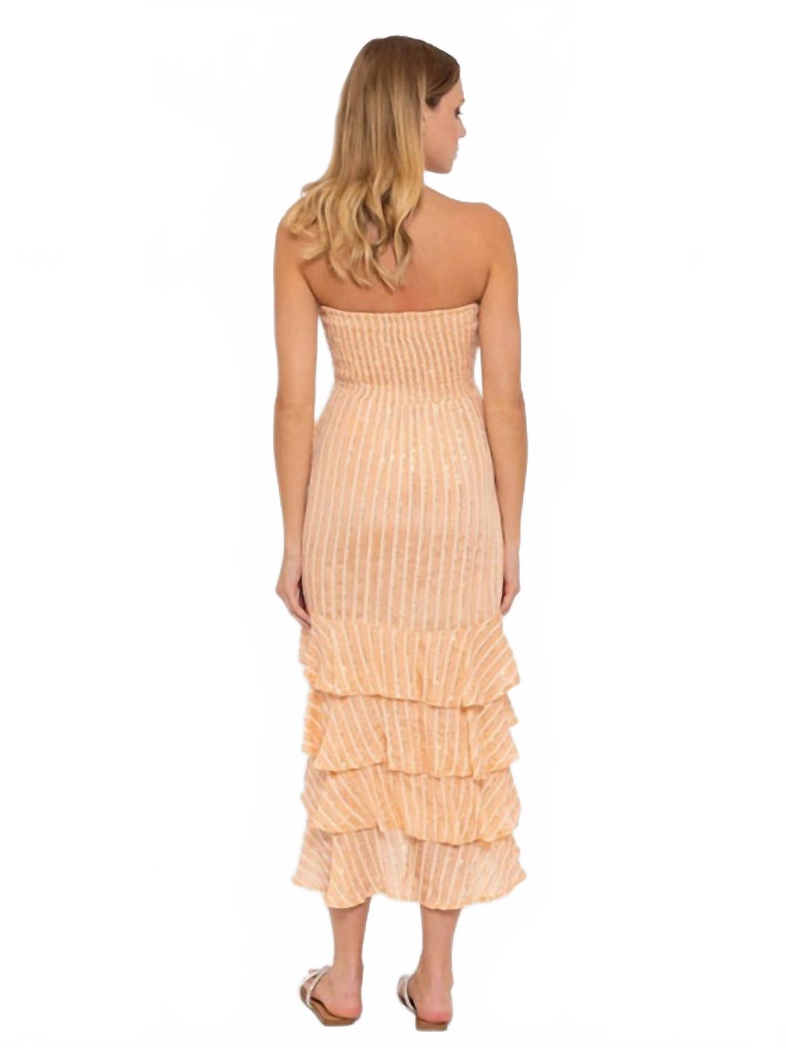 Откройте для себя элегантность с платьем Ilanila от Sundress, которое станет идеальным дополнением к вашему летнему гардеробу. Это платье без бретелек с асимметричным вырезом и эффектной завязкой на талии. Платье изготовлено из 100% вискозы на подкладке из 100% хлопка, оно удобно и стильно. Это персиковое платье в полоску с пайетками, изготовленное во Франции, придает изысканность благодаря присборенным воланам и присборенной спинке. Только химчистка.