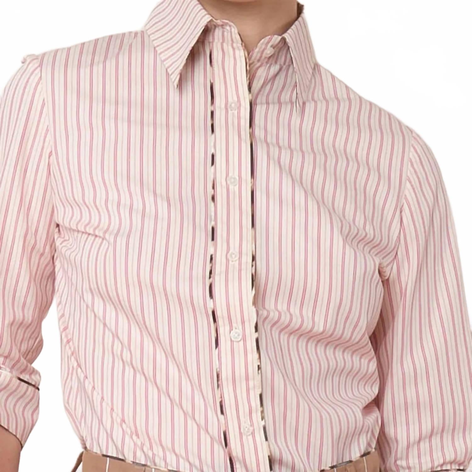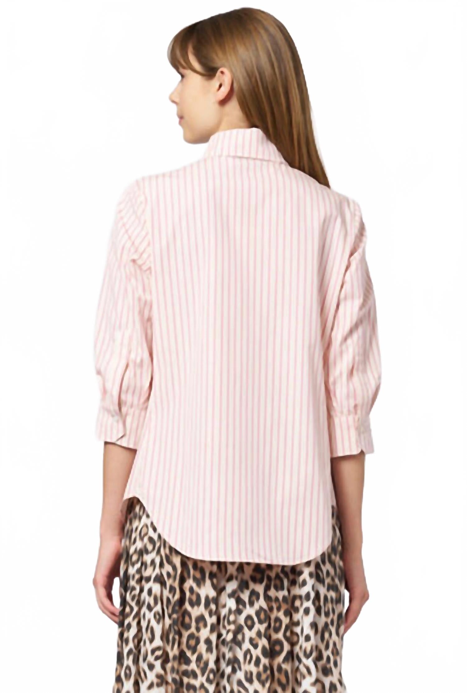 Сочетайте эту блузку с любимыми джинсами и шлепанцами для следующего девичника. Откройте для себя топ Emmanuelle Stripe Top от LA PRESTIC OUISTON - элегантный розовый вариант для вашего весеннего рабочего гардероба. Эта блузка с рукавами три четверти и элегантным воротником идеально сочетается со стильным полосатым узором. Изготовленная из 100% хлопка, она обеспечивает комфорт и воздухопроницаемость благодаря удобной застежке на пуговицы. Рекомендации по уходу включают машинную стирку и сушку в стиральной машине для легкого ухода.