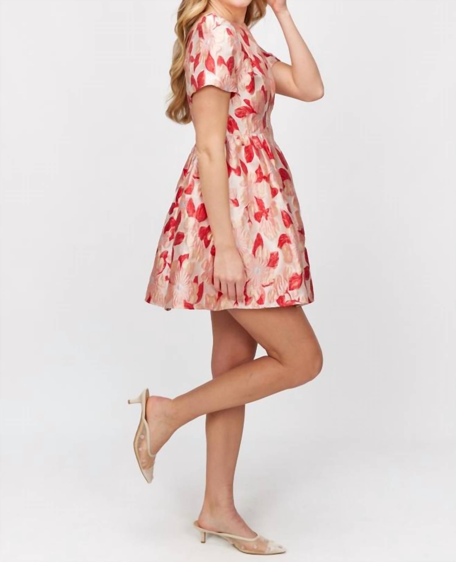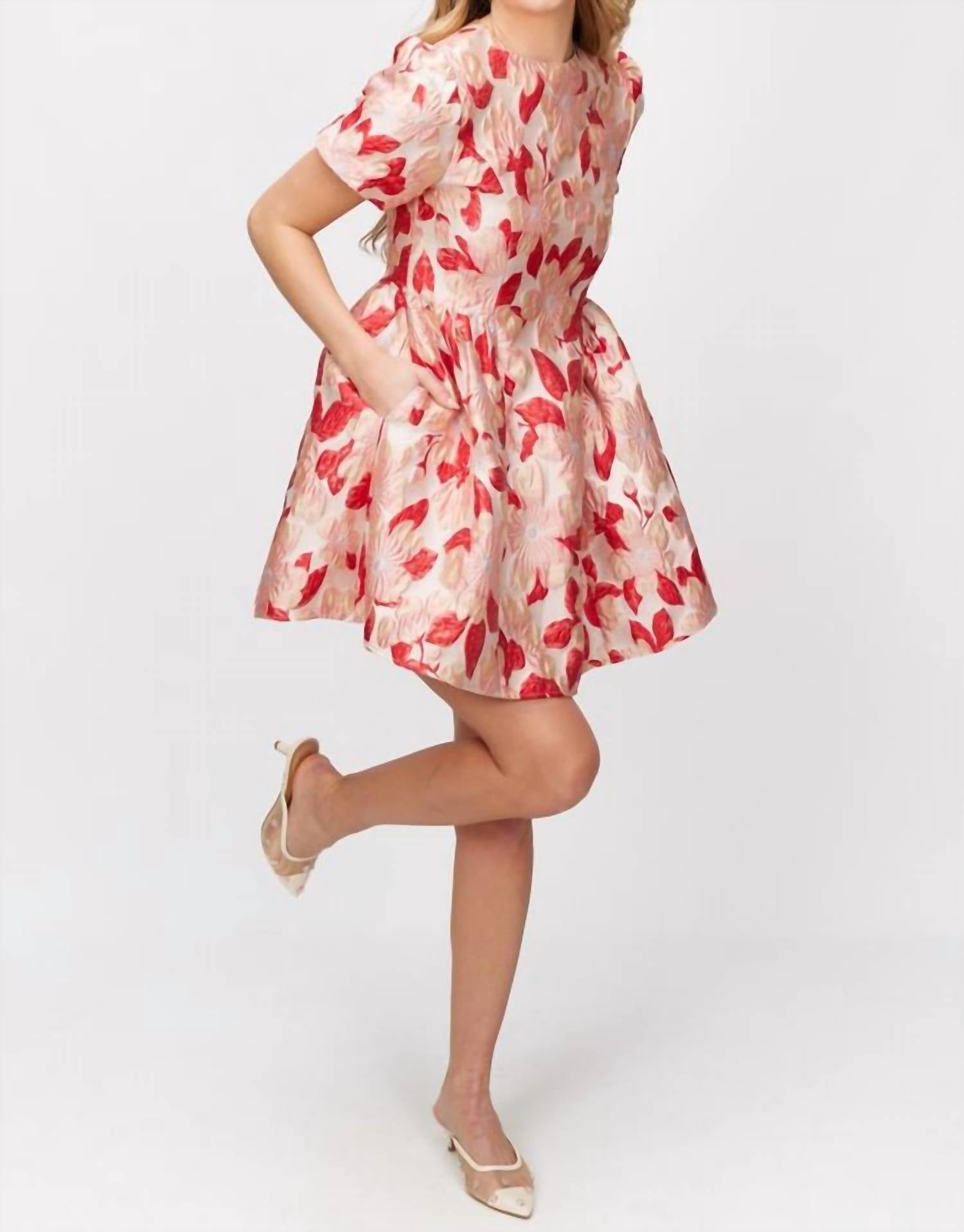Идеальное мини-платье для теплых месяцев. Жаккардовое мини-платье из коллекции Before You - очаровательное воплощение цветочной элегантности в яркой розово-красной гамме. Это женское платье с короткими рукавами и классическим круглым вырезом, дополненное мини-юбкой А-силуэта. Платье тщательно изготовлено из 100% полиэстера с подкладкой из 100% хлопка. Оно имеет удобные передние карманы и функциональную застежку-молнию сзади для удобства ношения. Сделано в Китае. Для сохранения текстуры и качества изделия необходима ручная стирка.