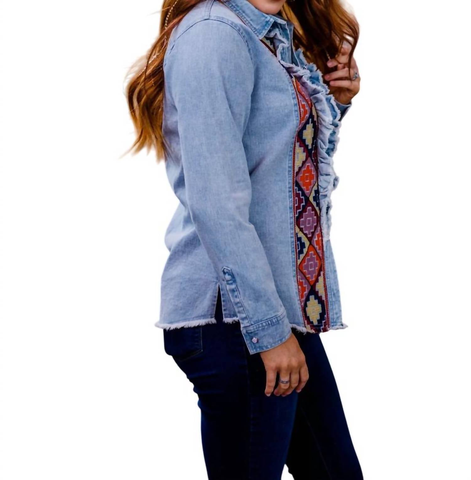 Идеально сшитая и мягкая на ощупь. Выйдите на стильный вечер в этой вышитой джинсовой рубашке от Layerz Clothing. Эта лазурная рубашка с длинными рукавами украшена изысканной ацтекской вышивкой и оборками. Рубашка изготовлена ​​из 100% хлопка. Благодаря удобной посадке и длине от 27,5 до 31,75 дюйма (в зависимости от размера), она идеально подходит как для родео, так и для повседневных прогулок. Застежка - удобные жемчужные кнопки. Уход прост: ручная стирка в холодной воде; сушить на вешалке для достижения наилучшего результата.