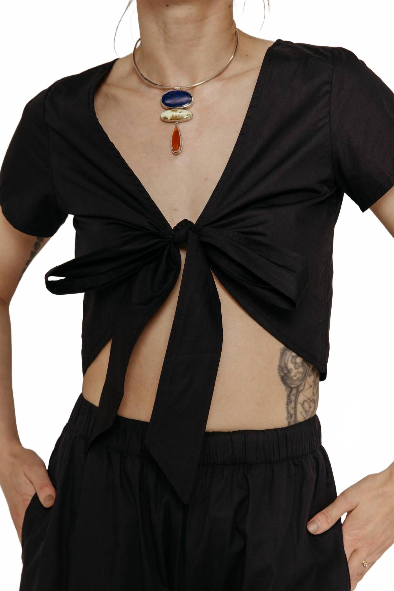 Универсальная блузка, которая подойдет и для работы, и для ужина! Встречайте топ Liana от RITA ROW - идеальное дополнение к вашему летнему гардеробу в шикарном темно-синем цвете. Этот укороченный топ с короткими рукавами изготовлен из 100% органического хлопка и имеет стильный вырез «лодочка» и универсальный бант, который можно завязать спереди или сзади, создавая индивидуальный образ. Изготовленная в Португалии, она является примером качества и экологичности. Дополните образ подходящими брюками, чтобы создать гармоничный образ.