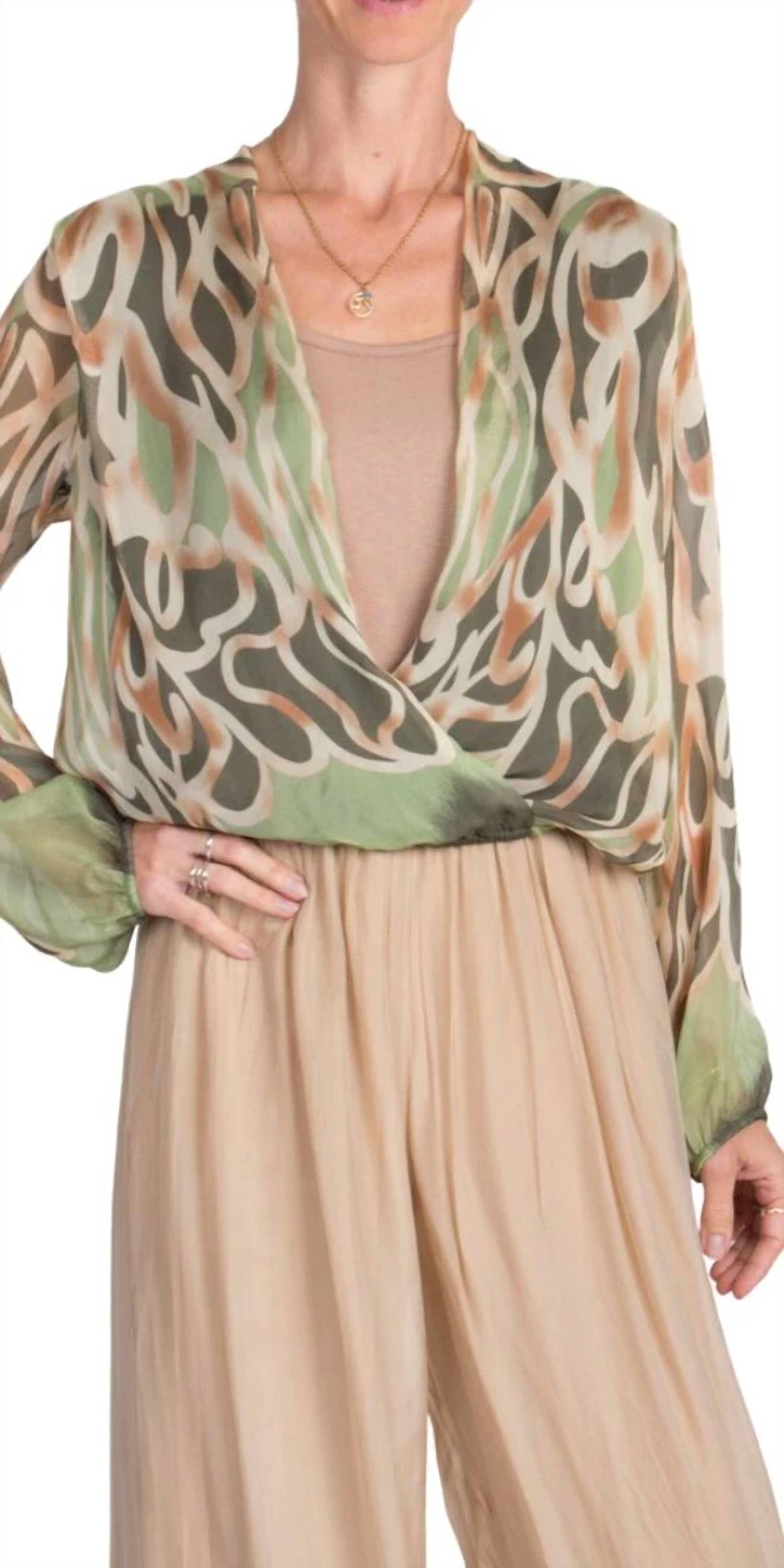 Изысканный выбор для вашего праздничного образа. Длинные рукава с эластичным подолом на запястьях и талии, а также шикарный глубокий V-образный вырез, украшенный стильным абстрактным принтом. Сшит из 30% шелка и 70% вискозы (внешняя сторона), подкладка из 95% вискозы и 5% эластана. Модель легко надевается. Сделано с заботой в Италии. Для достижения наилучших результатов рекомендуется машинная стирка, чтобы сохранить изысканную текстуру и посадку.