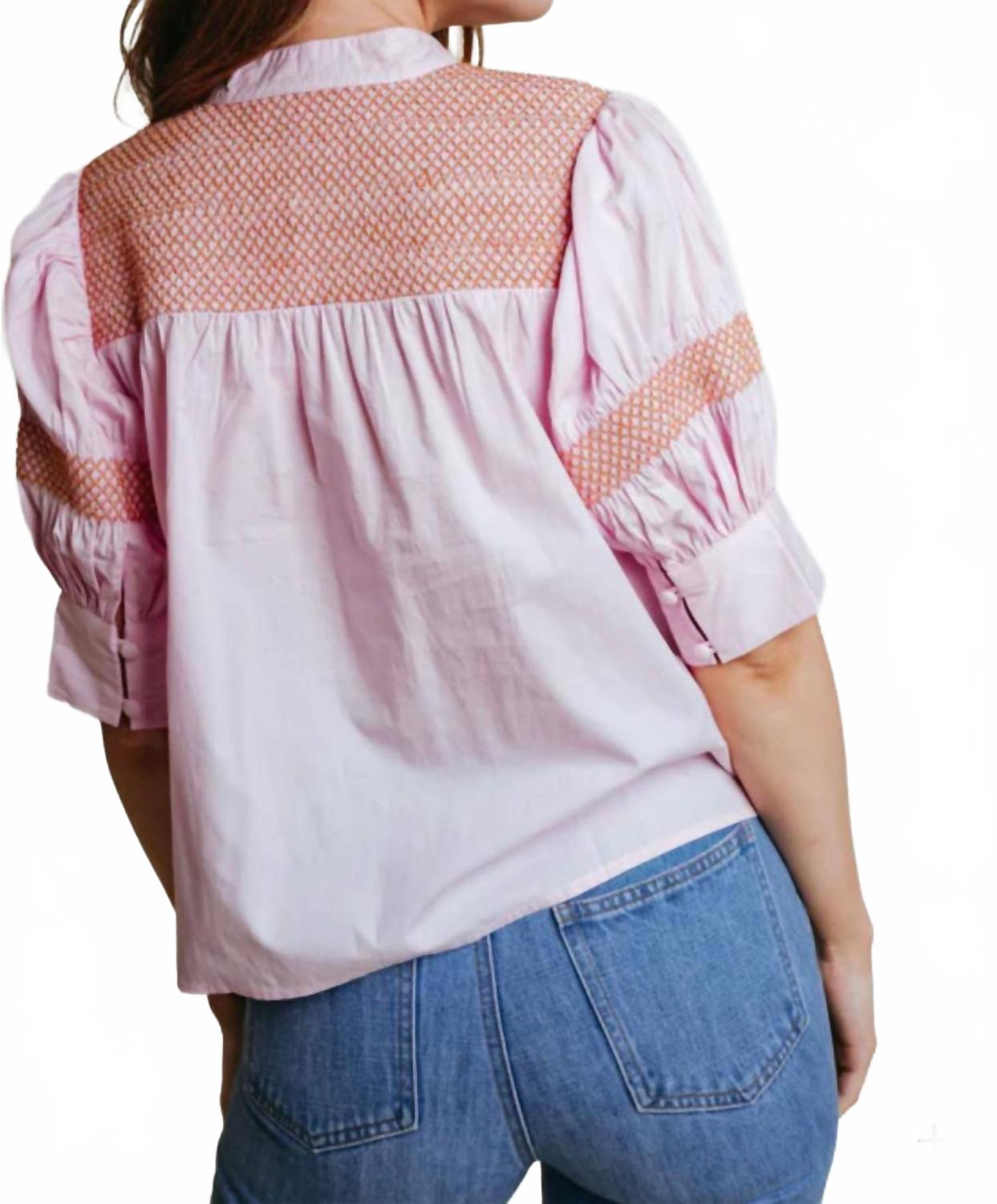 Встречайте блузку Sutton от LAROQUE - шикарное дополнение к вашему летнему гардеробу, идеально подходящее для Дня благодарения и новоселья. Эта блузка с рукавами до локтя нежно-голубого цвета, выполненная из хлопкового поплина, украшена сборками, элегантными манжетами и обтянутыми пуговицами. Блузка имеет узорчатый дизайн и удобную застежку на пуговицы. Для поддержания идеального состояния рекомендуется только химчистка. На модели размер S, рост 168 см.
