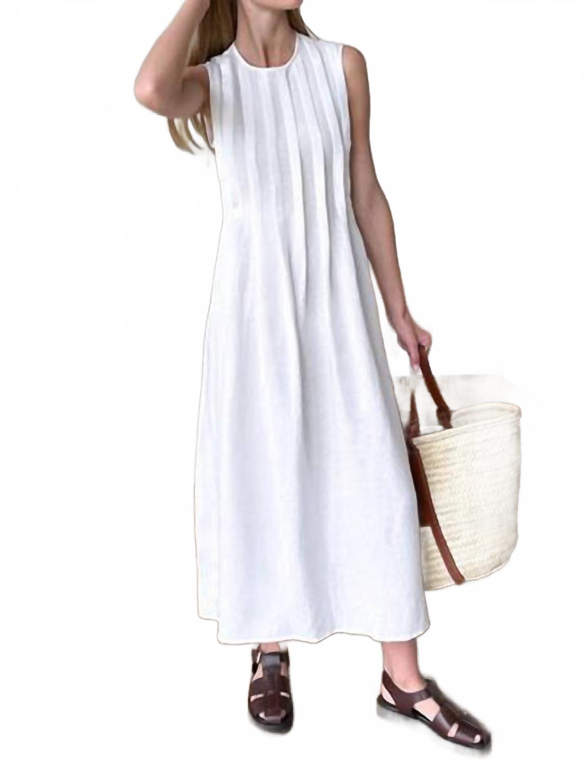 Платье макси, столь же милое, сколь и удобное. Откройте для себя непринужденную элегантность в платье макси Plait от EMERSON FRY, минималистичном шедевре белоснежного цвета. Это платье без рукавов выполнено из роскошной льняной ткани с закругленным круглым вырезом и плиссировкой спереди, подчеркивающей талию. Функциональный дизайн включает завязки по бокам, карманы и вырез-капельку сзади с застежкой на пуговицу. Платье, произведенное в Нью-Йорке, идеально подходит для весенних путешествий. Рекомендуется бережная ручная стирка.
