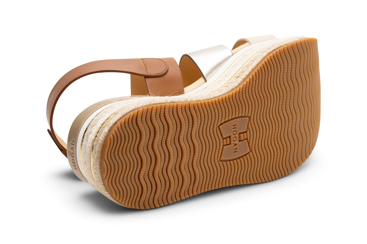 Кожаные босоножки Hogan H432 на танкетке, выполненные из коричневой и серебристой телячьей кожи с джутом, выполнены в стиле вестерн. Эти босоножки сочетают в себе элегантную цветовую палитру и удобную танкетку, что делает их стильным и универсальным выбором для самых разных случаев.