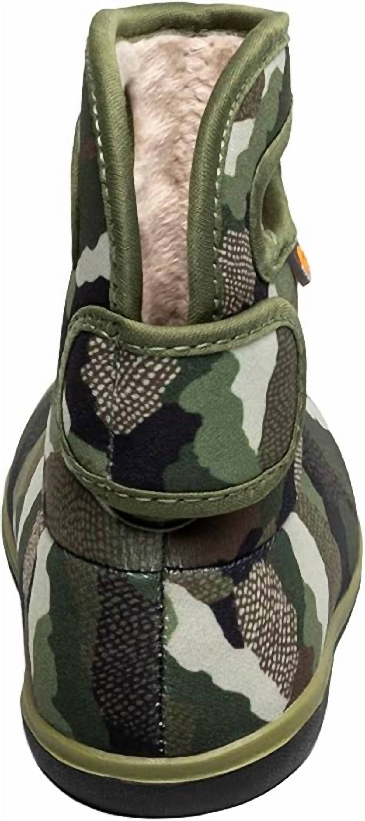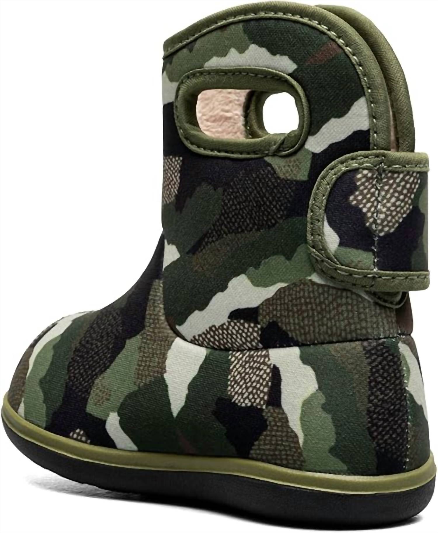 Представляем камуфляжные ботинки Baby Bogs 2 от BOGS - стильный и практичный выбор для активных малышей. Эти ботинки в зеленой многоцветной гамме на 100% водонепроницаемы, оснащены утеплителем толщиной 3 мм и технологией BOGS Max-Wick, чтобы сохранить детские ножки сухими. Они имеют круглый носок и плоскую пятку, а также экологичную стельку EVA BLOOM для дополнительного комфорта. Они полностью веганские и подходят для машинной стирки. Идеально подходят для непредсказуемой весенней погоды и рассчитаны на температуру до -10 °C.