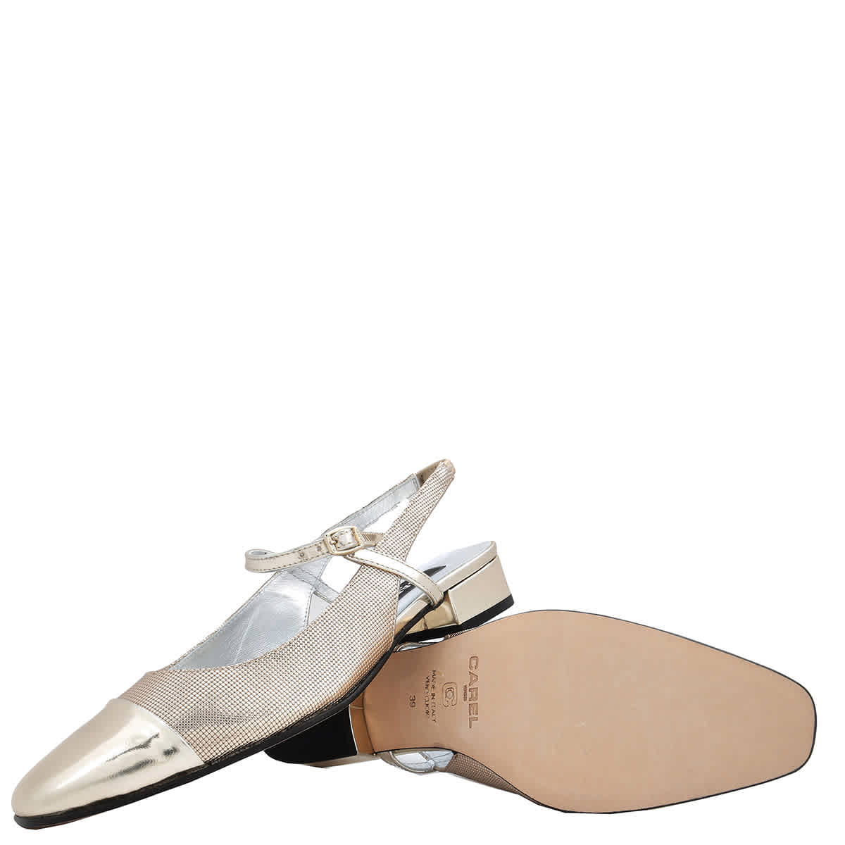 Женские босоножки Carel. Цвет: двухцветный платиновый тиснение. Босоножки-балетки Carel Oceano с открытой пяткой. Модель Oceano - это босоножки с открытой пяткой, фирменным прямым носком, сочетанием цветов и материалов, отражающим ДНК Carel, регулируемым ремешком для элегантной посадки и кожаной подошвой с нескользящей резиновой накладкой, украшенной фирменным узором Carel для дополнительной гибкости. Сделано в Италии.
