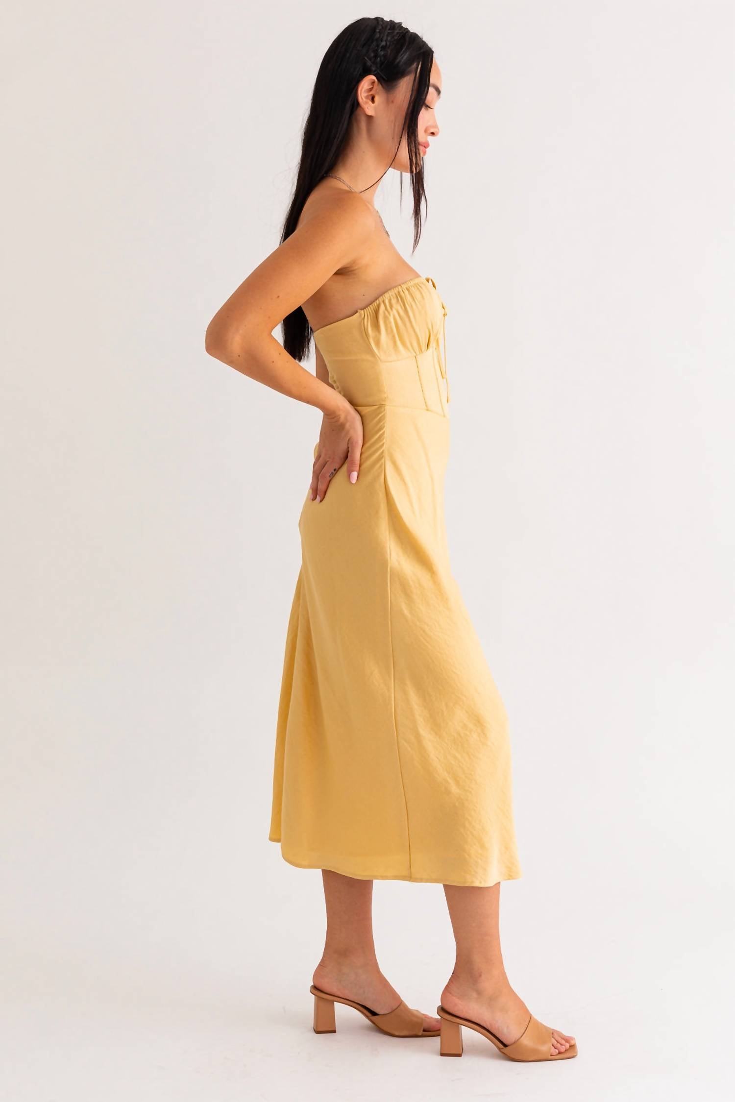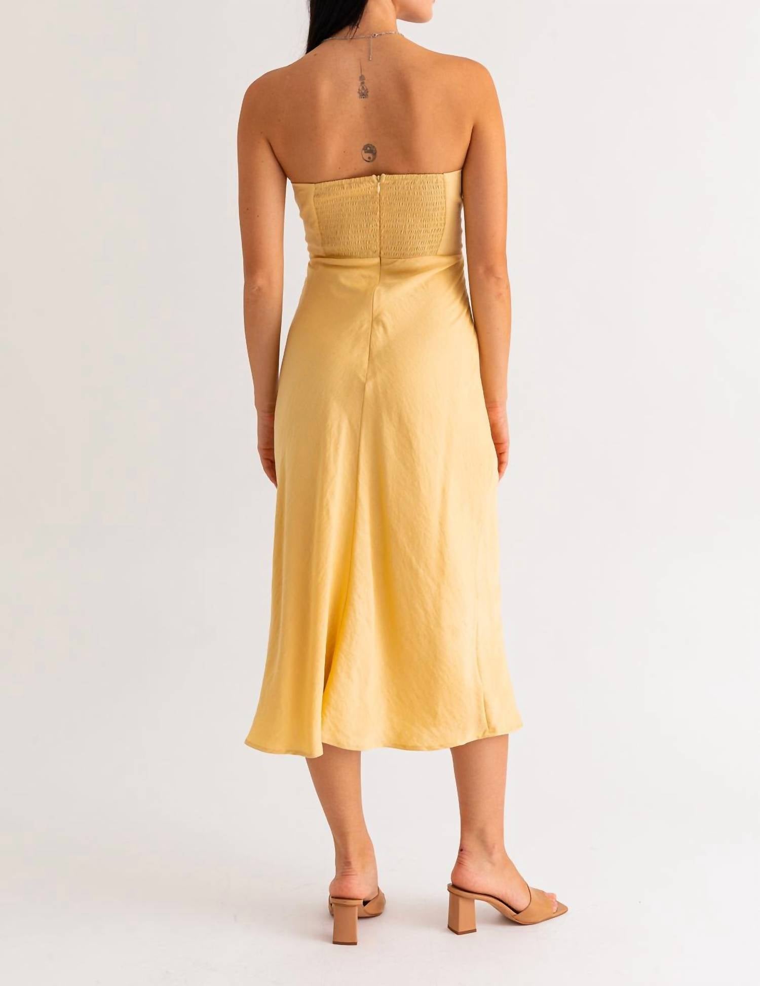 Просто добавьте шлепанцы или мюли, и все готово. Платье миди LE LIS Geneva цвета пыльно-желтого цвета добавит солнечного света в ваш гардероб благодаря своему яркому, смелому цвету и идеально подходит для свадеб и торжественных мероприятий. Это платье А-силуэта без бретелек с косточками и эластичной сборкой на спине обеспечивает удобную регулируемую посадку. Платье изготовлено из ткани с минимальной эластичностью и украшено завязкой на груди, что обеспечивает комфорт и стиль. Застежка: молния. Рост модели 175 см, размер S.
