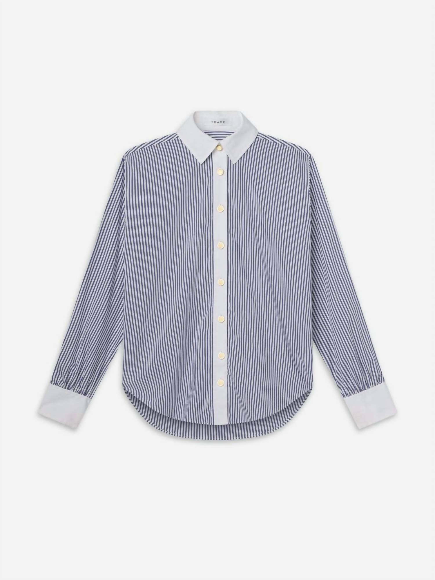 Сочетайте ее с любимыми джинсами и шлепанцами для следующей девичьей вечеринки. Рубашка Borrowed Stripe с длинным рукавом от FRAME, выполненная из темной ткани шамбре, станет стильным и универсальным дополнением к вашему гардеробу. Эта блузка с воротником и полосатым узором застегивается на пуговицы, что делает ее стильным выбором как для работы, так и для помолвки. Длина рукава - длинные. Идеальный вариант для весны: легкий хлопковый поплин обеспечивает свободный крой, который можно носить как слой одежды, так и отдельно.