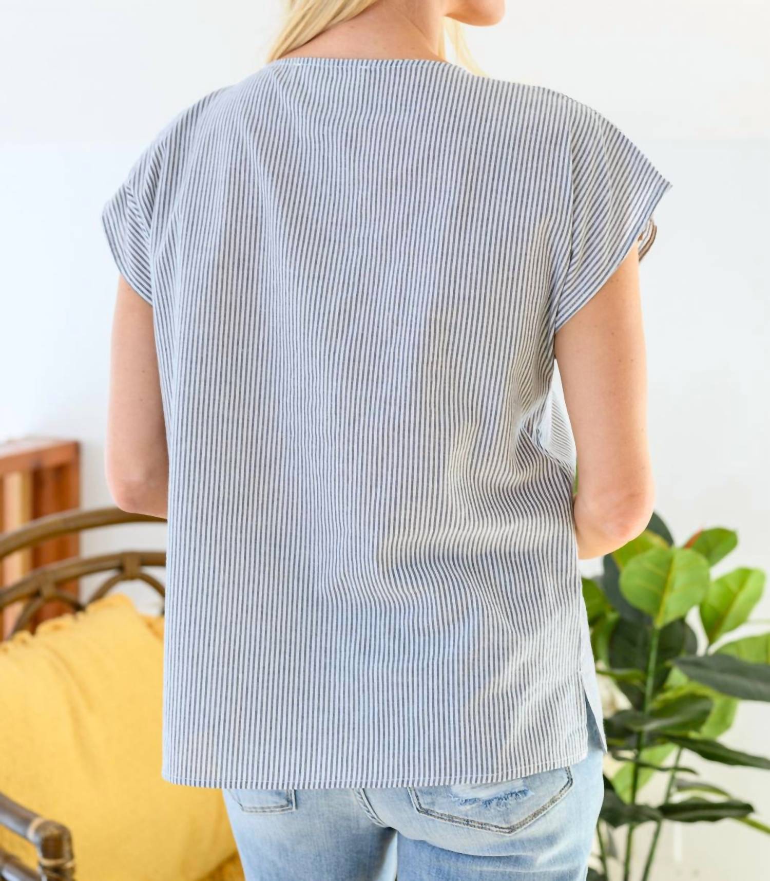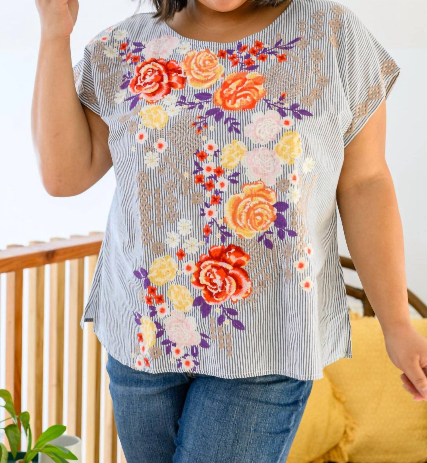 Сочетайте его с любимыми джинсами и шлепанцами для следующего девичника. Встречайте полосатый топ с цветочным принтом Canopy Of Crushes от ANDREE BY UNIT - идеальный акцент для вашего гардероба. Эта блузка из легкого 100% хлопка имеет округлый вырез и короткие рукава «летучая мышь» для свободного кроя. Сине-белая тонкая полоска прекрасно дополняет цветочную вышивку, делая ее шикарным выбором для повседневных случаев. Этот топ, изготовленный в США, имеет длину 25,5 дюйма и прост в уходе: машинная стирка и сушка на веревке.