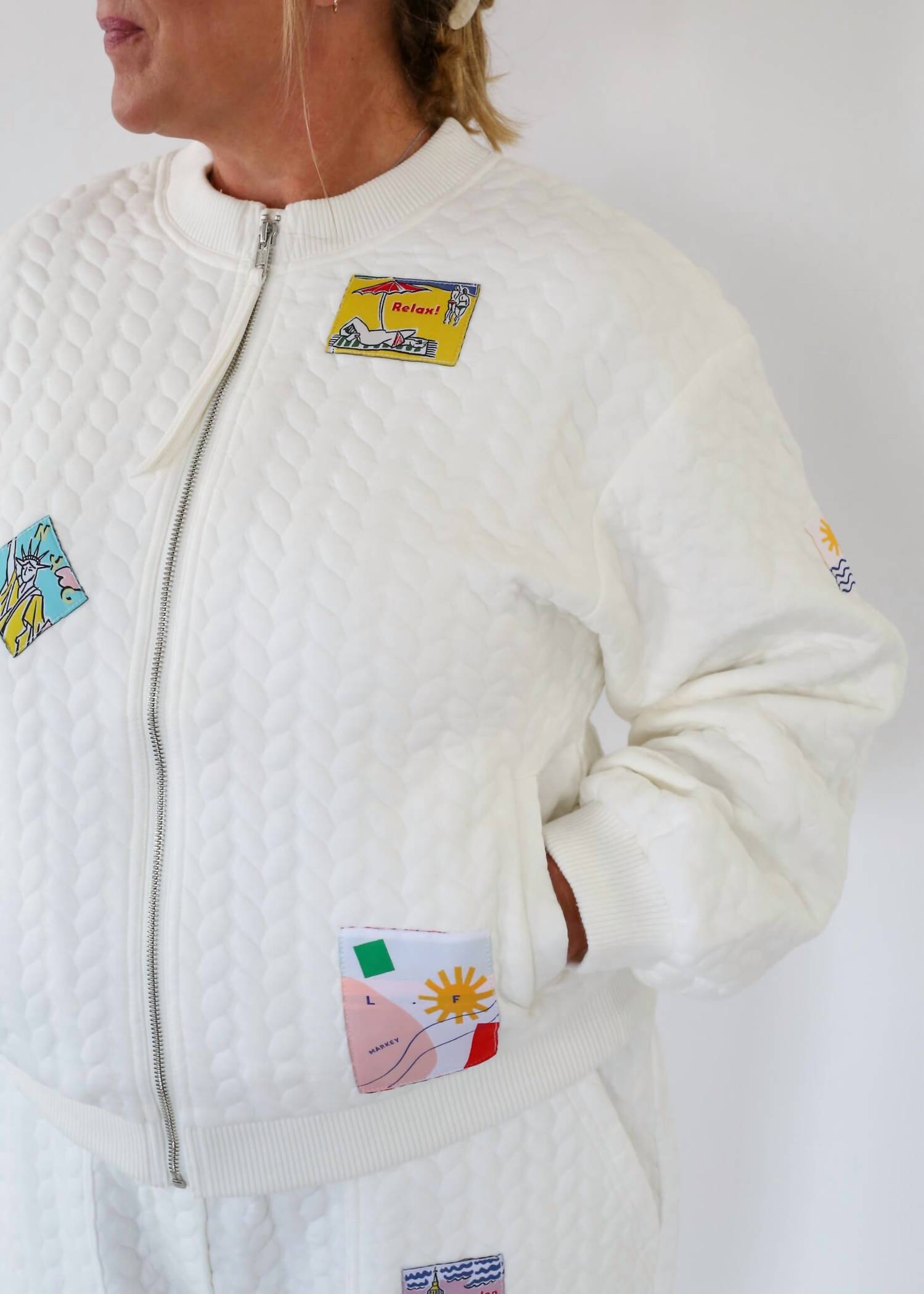 Представляем куртку Gus Zip Up от LF Markey - стильный отсыл к ретро-дизайну с современным оттенком в белом цвете. Эта женская практичная куртка из 100% хлопка с длинными рукавами и круглым вырезом обеспечит комфорт во время осенних путешествий. Уникальные тканые нашивки и боковые карманы добавляют индивидуальности этой модели с узором, слегка свободной посадки. Застежка: молния. Идеально подходит для создания образа в стиле преппи для путешествий в этот день, 4 июля.
