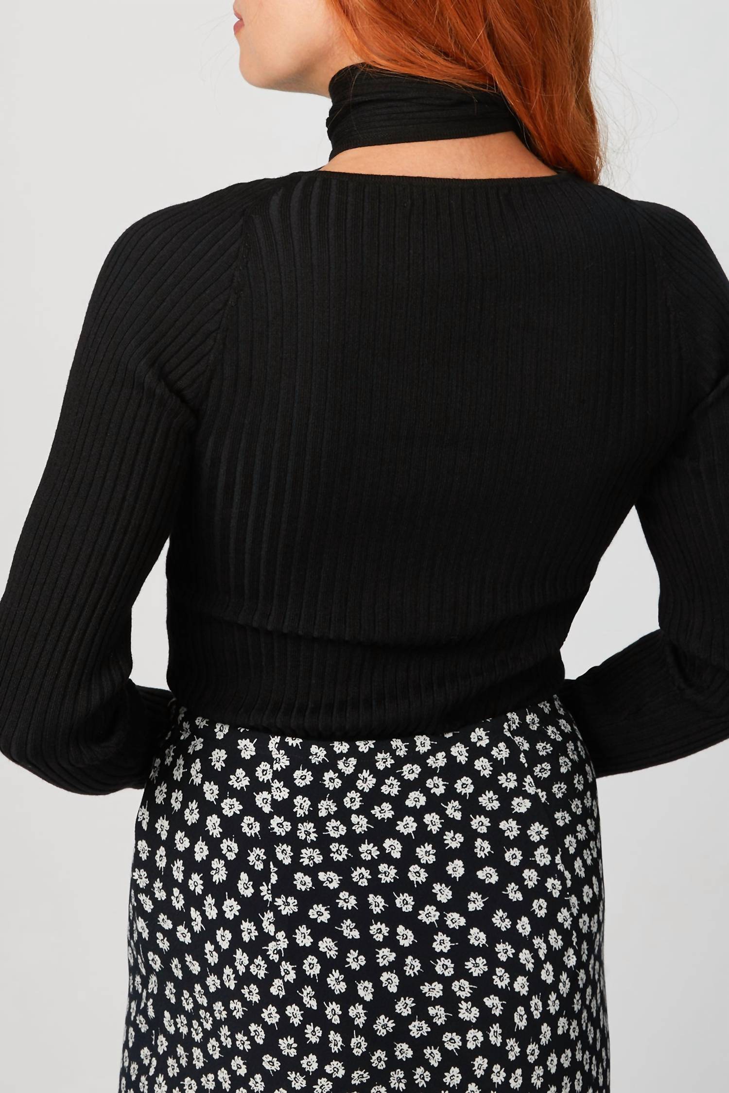 Этот трикотаж связан в Новой Зеландии из облегающего трикотажа в рубчик цвета фуксии, который повторяет естественные изгибы тела. Длинные рукава подчеркнуты перекрещивающейся халтер-бретелькой, создающей соблазнительный вырез на груди. Для универсальности петлю можно оставить свободной спереди или сзади.