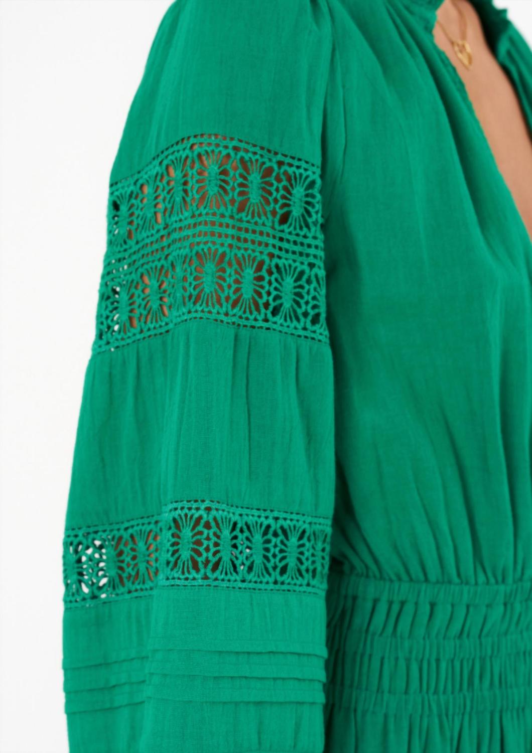 Просто добавьте шлепанцы или мюли, и все готово. Откройте для себя очаровательное платье миди Loretta с V-образным вырезом от MABE - яркое дополнение зеленого цвета, идеально подходящее для весенних торжеств, таких как годовщины. Это платье А-силуэта с длинными, пышными рукавами и фактурным узором с игривыми оборками. Глубокий V-образный вырез и эластичный пояс обеспечивают комфорт, а застежка-липучка обеспечивает легкость надевания. Это платье идеально подходит для самых разных случаев, сочетая в себе стиль и удобство.