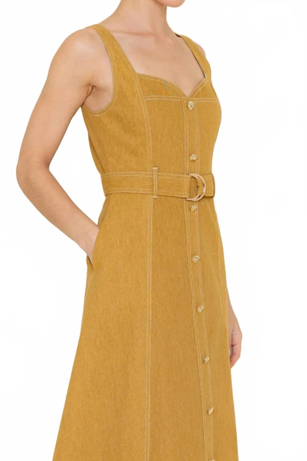 Платье идеальной длины существует. Представляем платье Cider Sippin' Belted Dress от Fore Collection - шикарное платье миди насыщенного карамельного оттенка, идеально подходящее для летнего отдыха и уличного стиля. Это платье без рукавов отличается привлекательным А-силуэтом с отстрочкой-бюстье и вырезом в форме сердечка, дополненным пуговицами. Пояс на талии обеспечивает идеальную посадку, а золотистый деним добавляет роскошную текстуру. Платье также дополнено удобными карманами для дополнительной функциональности.