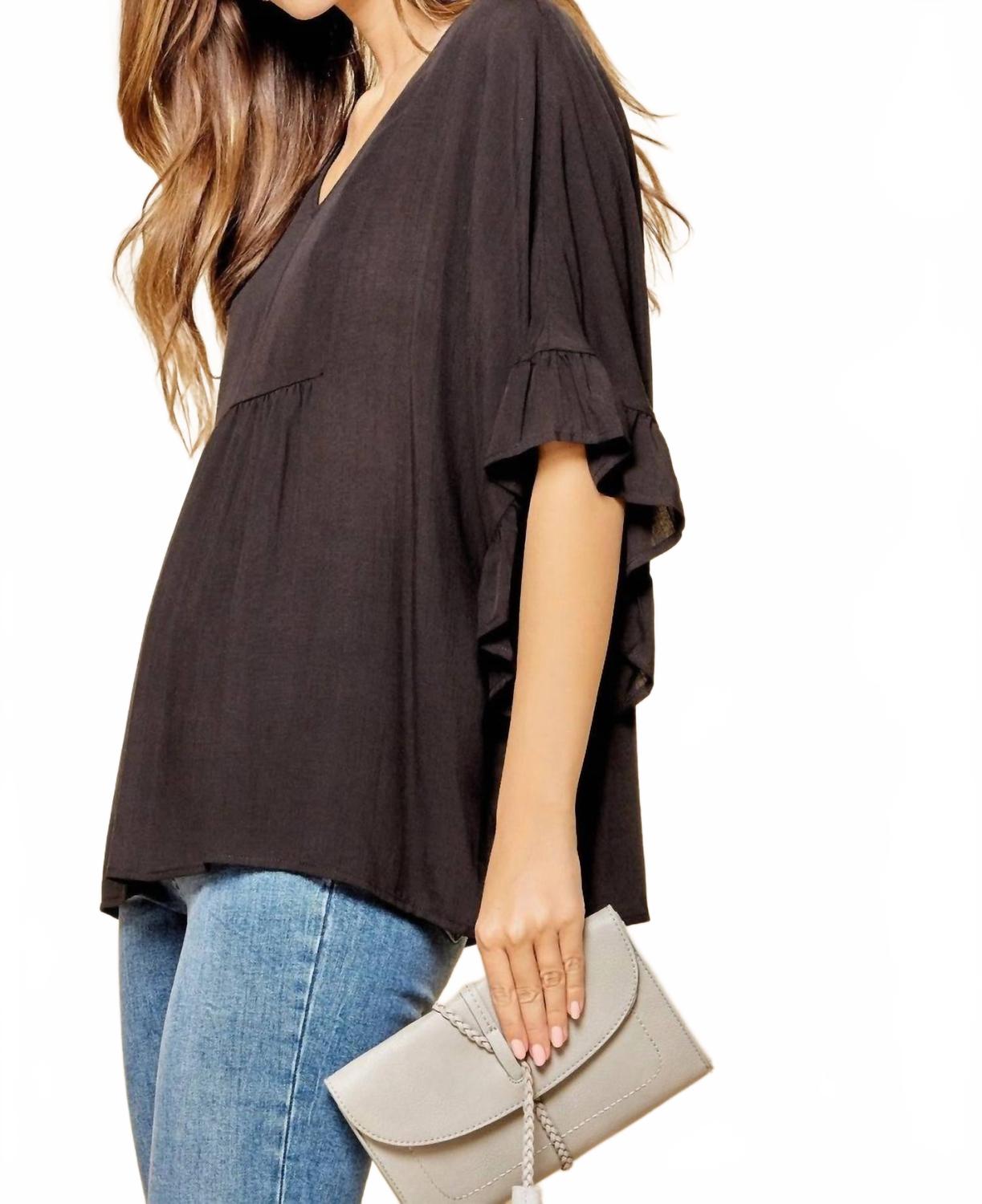 Подчеркните свой стиль с помощью топа с оборками на рукавах от ANDREE BY UNIT, который сочетает в себе комфорт и элегантность. Эта однотонная черная блузка, напоминающая пончо, имеет рукава-«летучая мышь» длиной до локтя, оборки и V-образный вырез, дополненный плиссировкой и струящимся лифом. Изготовленная из 100% вискозы, она отличается свободным силуэтом, не тянется и застегивается на застежку. Уход: ручная стирка в холодной воде.