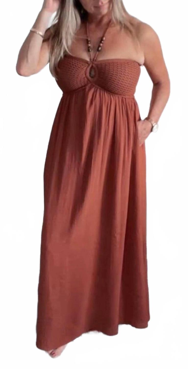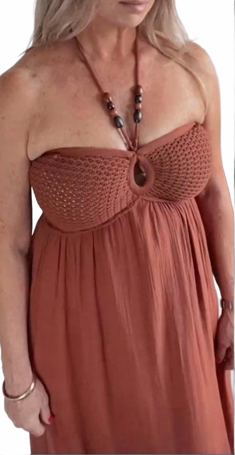 Кто не любит хорошее макси-платье? Это платье, которое вы будете носить каждый сезон. Откройте для себя элегантность в стиле бохо-шик с платьем макси Halter от Blu Pepper - великолепным выбором для любого отпуска. Это платье без рукавов А-силуэта однотонного коричневого оттенка с удобной застежкой-липучкой и привлекательным V-образным вырезом. Практичный дизайн включает в себя удобные карманы для самых необходимых вещей. Это вязаное крючком изделие идеально подходит для летних каникул и празднования Дня независимости.