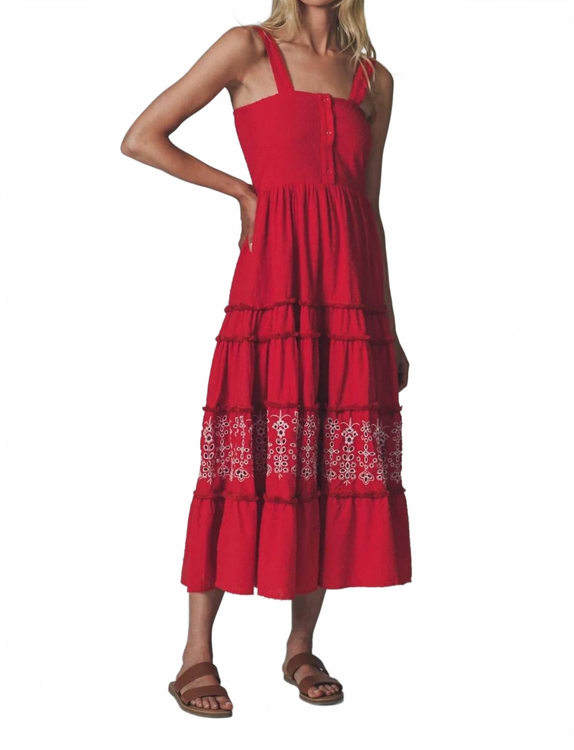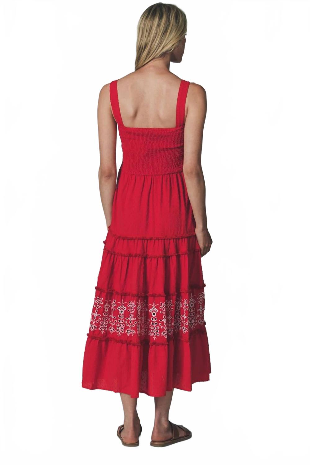 Просто добавьте шлепанцы или мюли, и все готово. Представляем платье-миди Regan от THE SHIRT - незаменимую вещь в стиле бохо-шик в ярко-красном цвете, идеально подходящую для летних путешествий. Это платье без рукавов с вышитыми вырезами, игривыми оборками и выгодно подчеркивающим фигуру А-силуэтом со стильным квадратным вырезом. Платье изготовлено из 100% вискозы на подкладке из 100% хлопка и имеет удобную застежку на пуговицы. Отсутствие карманов делает его элегантным и отличным выбором для вашего летнего гардероба.