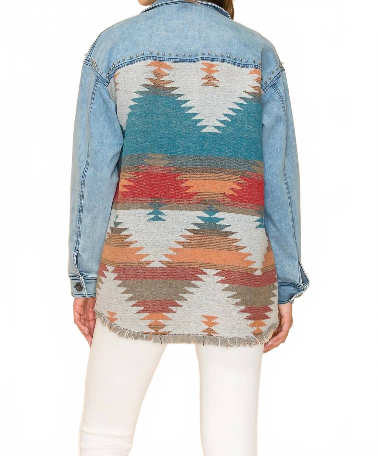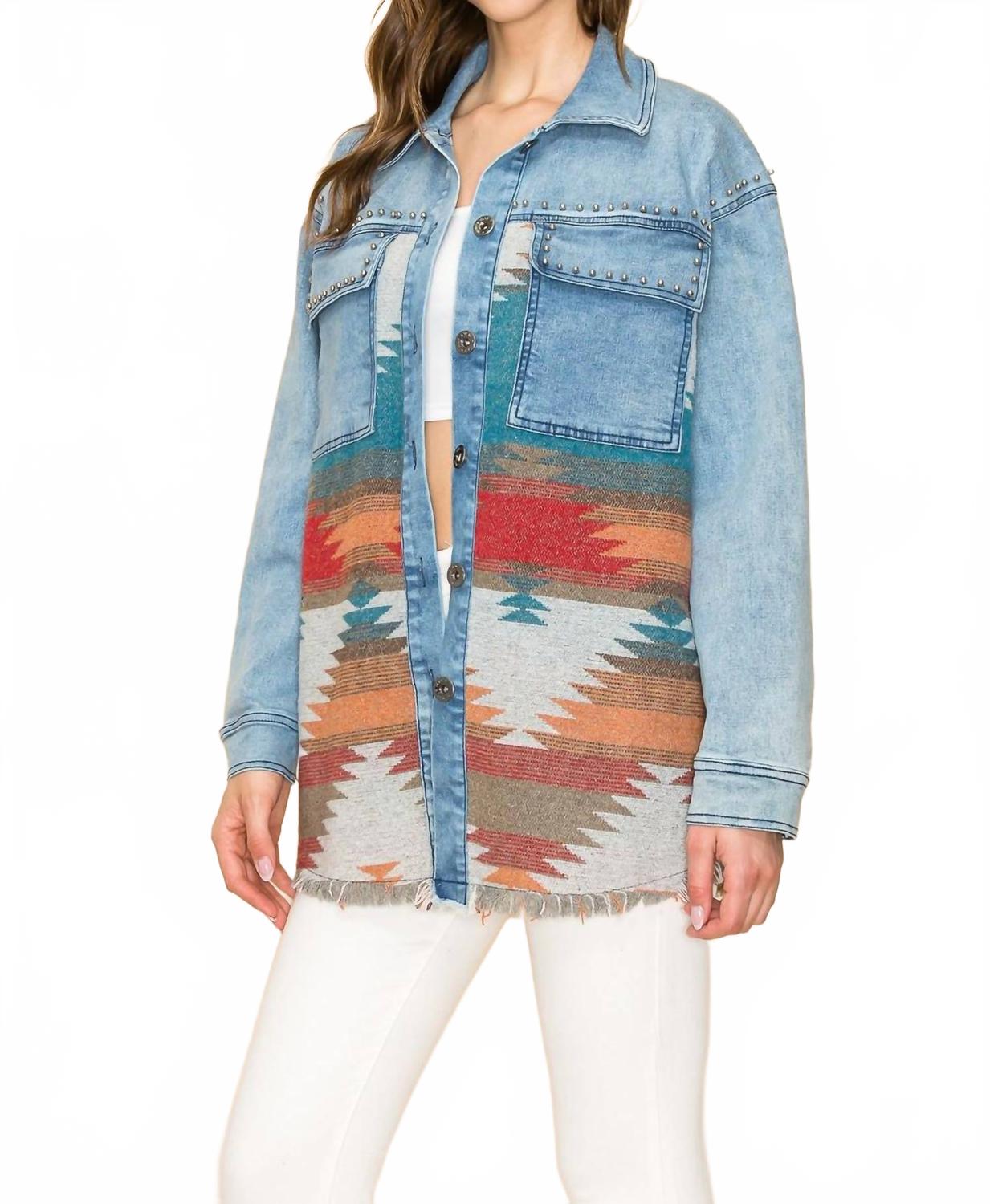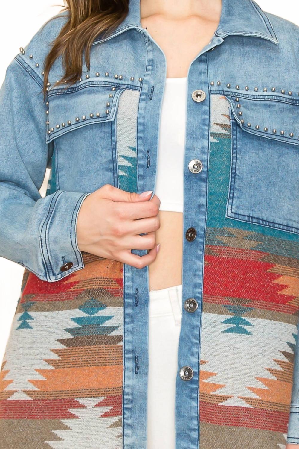 Яркая джинсовая куртка с эффектным бирюзовым принтом и металлическими люверсами. Осенняя джинсовая куртка с длинными рукавами, застежкой на пуговицы спереди и классическим воротником с функциональными нагрудными карманами. Идеально подходит для путешествий и уличной одежды. Украшена эффектными заклепками и ацтекским узором, которые выделят вас среди других. Свободная посадка по размеру. Уход простой: машинная стирка и сушка в стиральной машине.