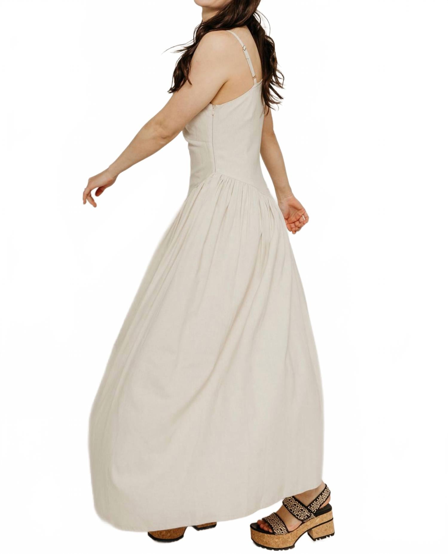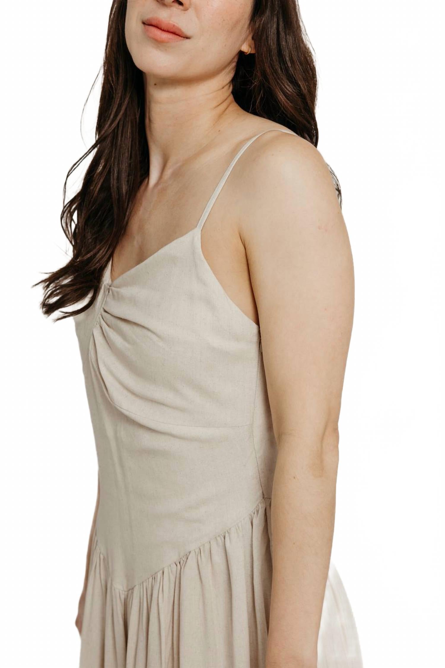 Дополните это макси-платье любимым эффектным ожерельем и босоножками для идеального образа. Представляем льняное платье Chenoa от TACH - изысканный выбор для любой помолвки. Это бежевое макси-платье без рукавов с драпированным вырезом и потайной молнией сзади создает плавный, элегантный силуэт. Изготовленное из роскошной смеси 70% льна и 30% вискозы, оно обеспечивает комфорт и приятное ощущение на коже. Это однотонное платье А-силуэта идеально подходит для летних случаев и станет неотъемлемой частью любого гардероба.