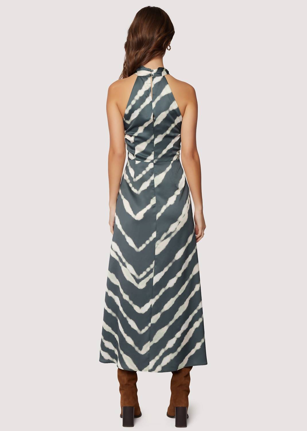 Это макси-платье сочетает в себе современную изысканность и привлекательный дизайн. Платье выполнено из гладкой атласной ткани, что создает ощущение роскоши. Высокий вырез и абстрактный принт придают ему выразительный визуальный акцент, а разрез сбоку подчеркивает элегантный силуэт. Идеально подходит для особых случаев и прекрасно сочетается с каблуками или сапогами, создавая изысканный и элегантный ансамбль.