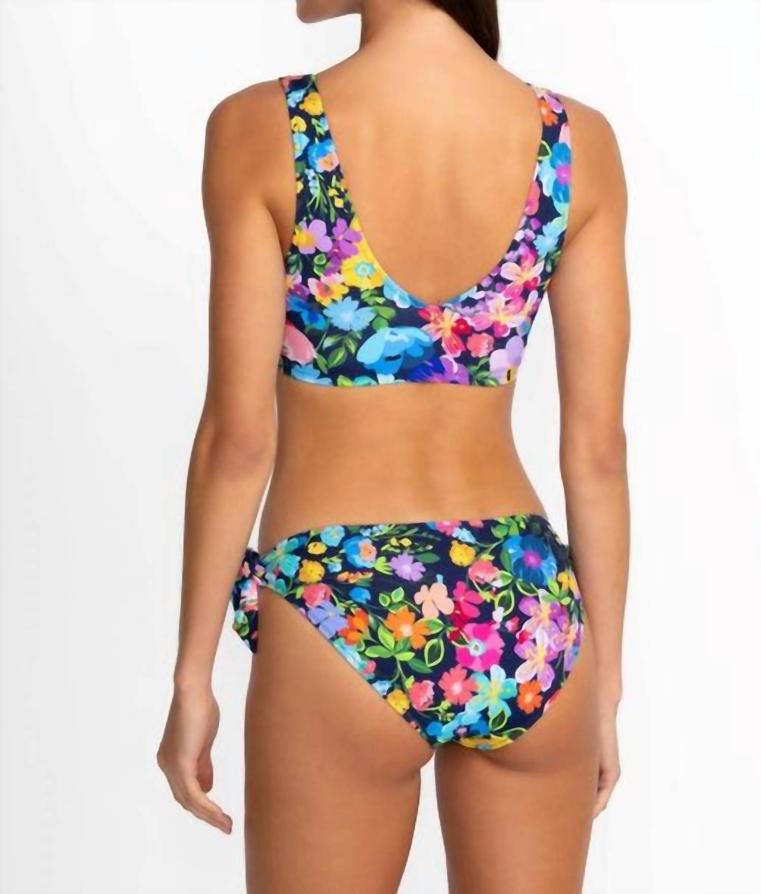 Мечтайте о своем следующем пляжном отдыхе в этом милом купальнике. Дополните его сандалиями на ремешках, шляпой с широкими полями и большой сумкой-тоут, чтобы завершить идеальный отпускной образ. Плавки-хипстеры с завязками по бокам, украшенные яркими цветочными мотивами на темно-синем фоне, предлагают свежий взгляд на классическое бикини. Эти плавки на подкладке с низкой талией и имитацией завязок по бокам подчеркнуты ярким цветом. Дополните образ топом-бикини Wild Bloom, чтобы создать современный образ у бассейна.