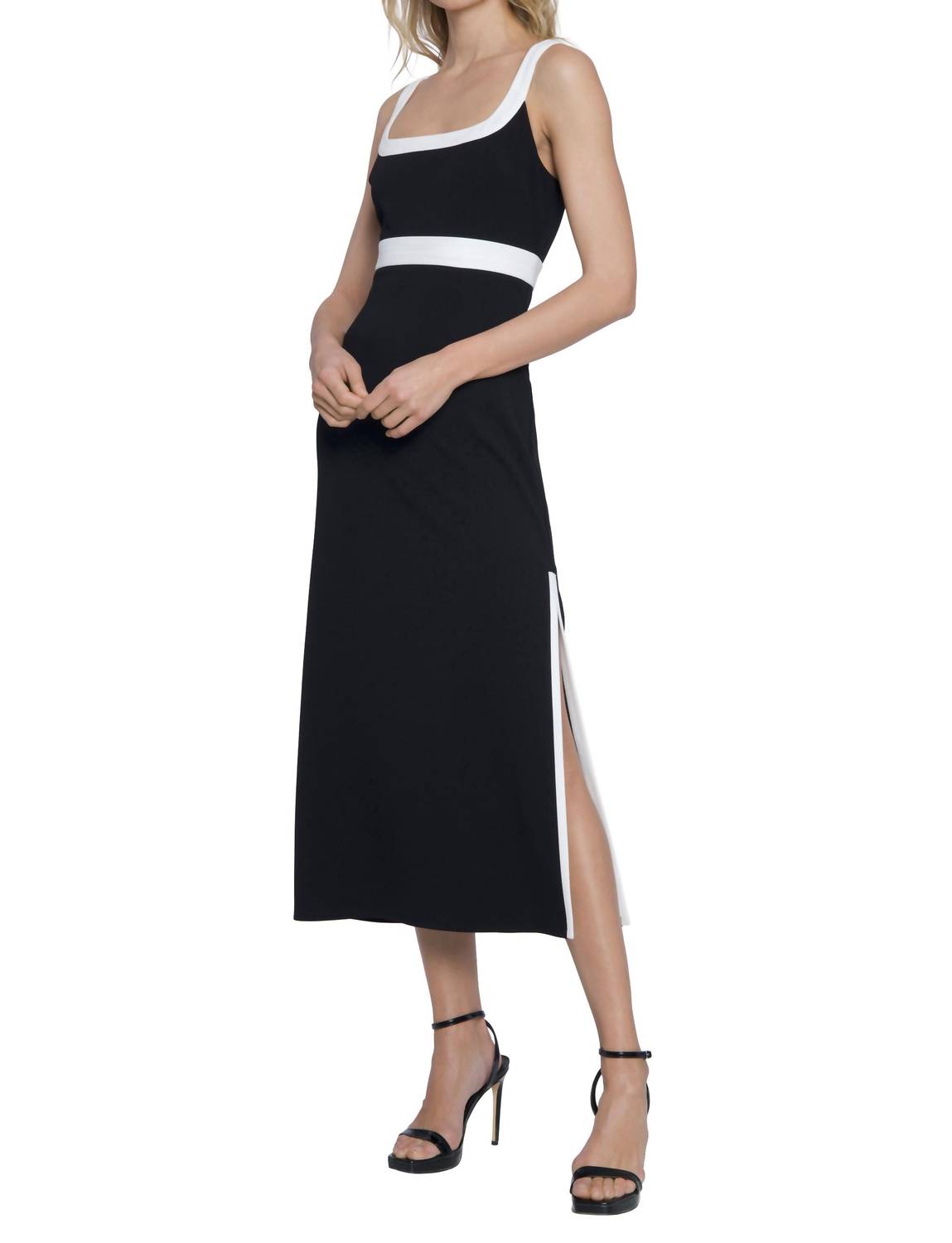 Изысканная модель в классическом черно-белом цвете. Изготовлена из крепа-скуба, состоящего на 96% из полиэстера и на 4% из спандекса, обеспечивает комфортный облегающий силуэт. Модель отличается стильным боковым разрезом, квадратным вырезом горловины и эффектным широким белым ремешком и деталями на талии. Застегивается на удобную молнию. Для сохранения элегантного вида требуется химчистка. Идеально подходит для офиса и званого ужина.