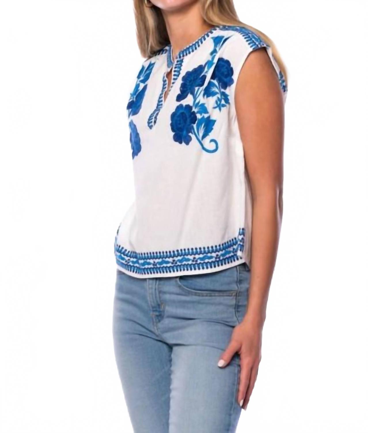 Универсальная блузка, которая подойдет и для работы, и для ужина! Представляем топ Tari Azure от Tolani - стильное и непринужденное дополнение к вашему весеннему гардеробу. Эта блузка без рукавов изготовлена ​​из 100% хлопка и украшена очаровательным цветочным узором с синей вышивкой по V-образному вырезу и подолу. Без карманов и с застежкой-липучкой, она идеально подходит для любого праздника. Уход за изделием: машинная стирка в холодной воде и сушка на веревке, при необходимости гладьте утюгом с холодной водой.