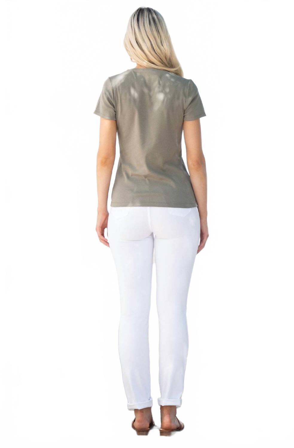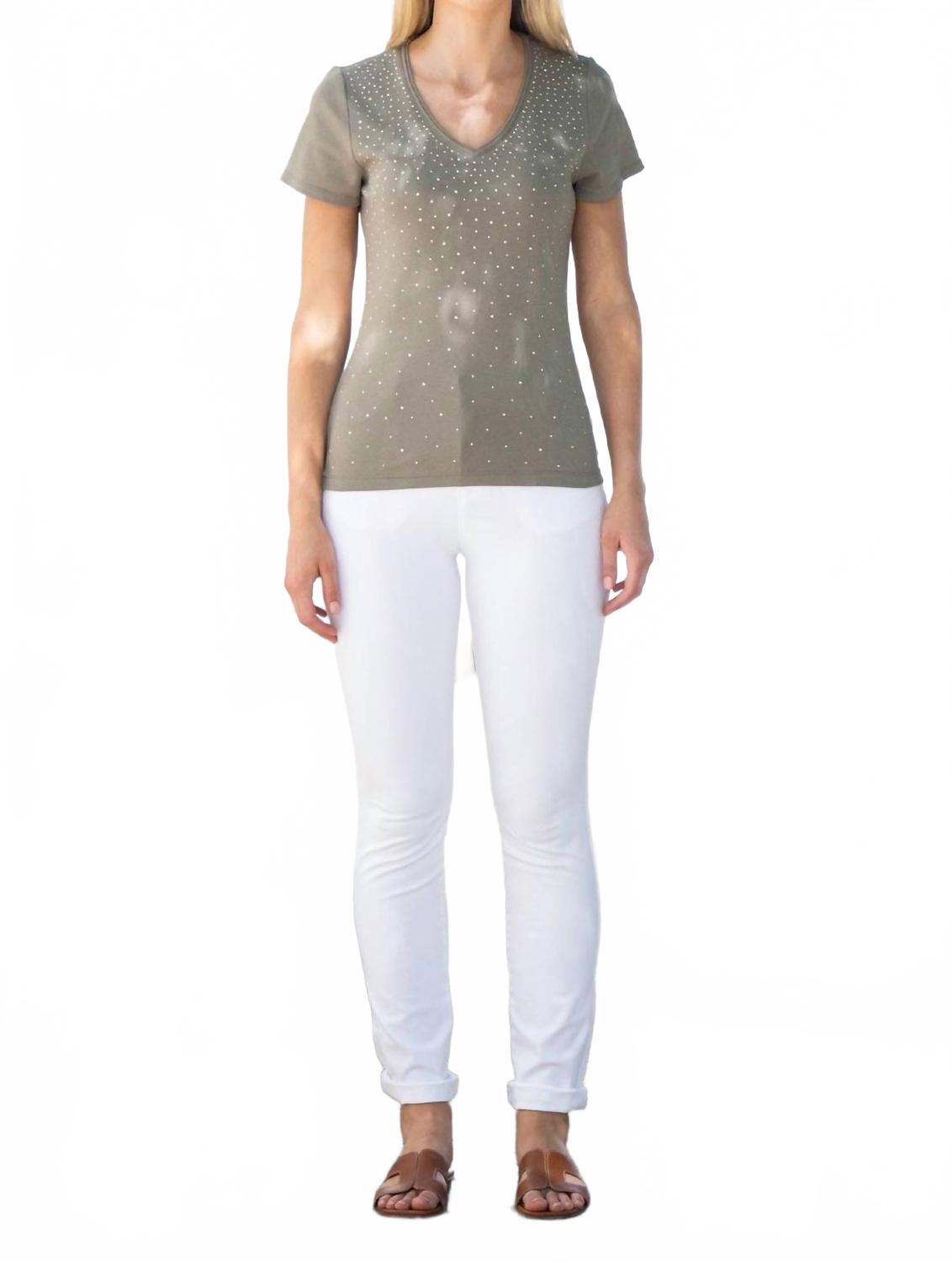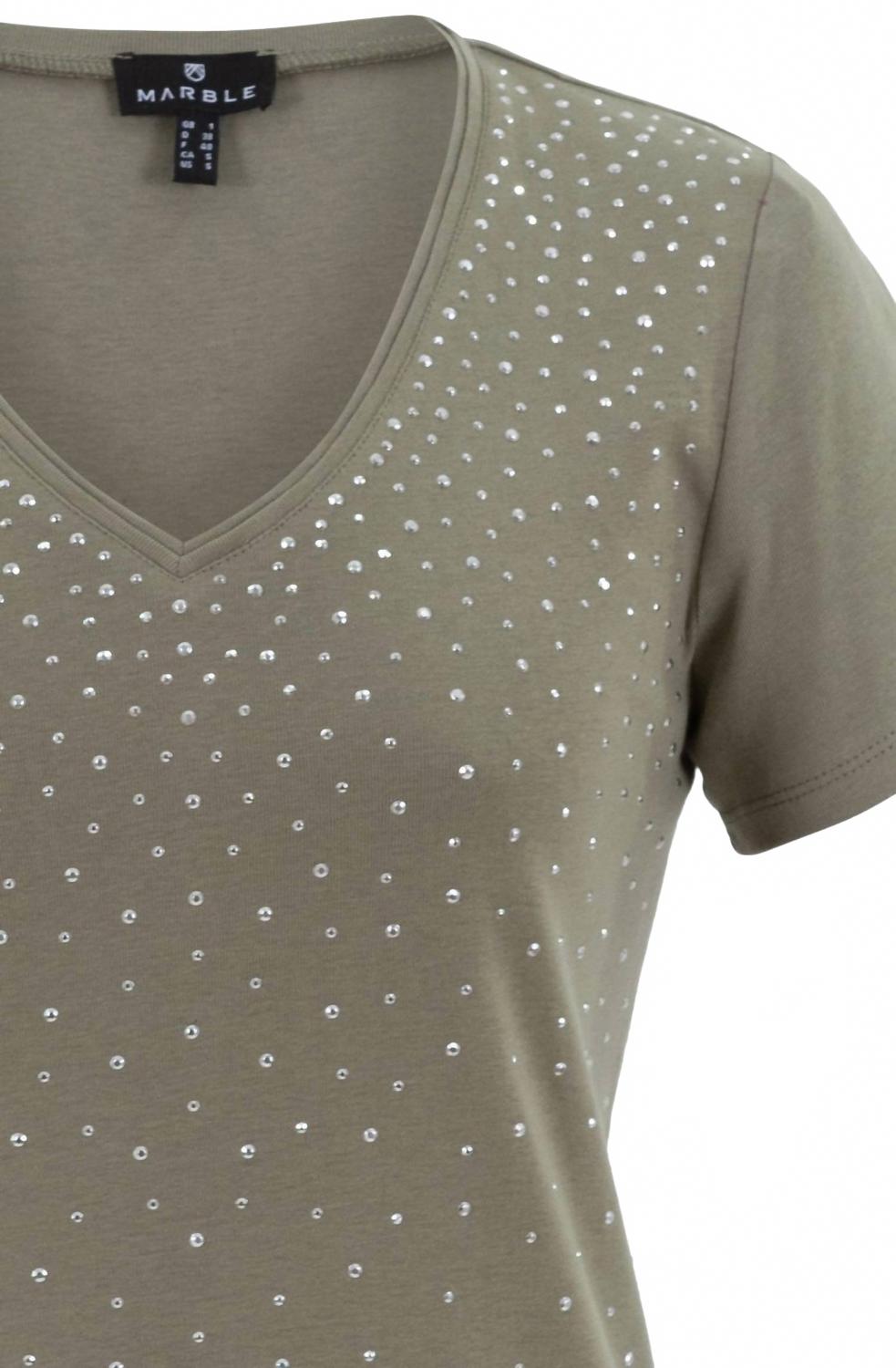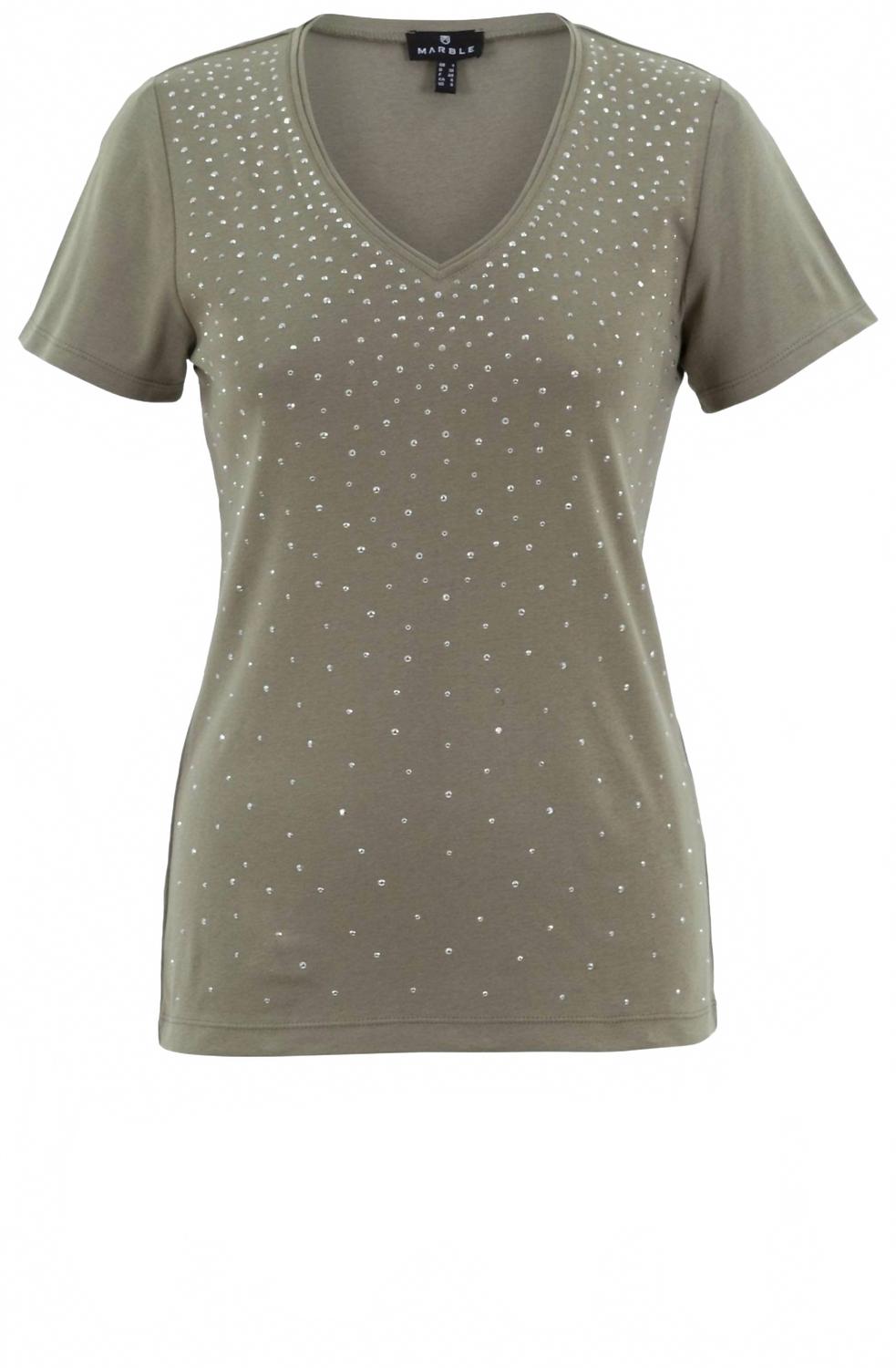 Не ищите дальше - вы нашли свою идеальную футболку! Представляем футболку Dot от MARBLE - трикотаж цвета хаки с V-образным вырезом, подчеркивающий фигуру. Этот топ с короткими рукавами украшен потрясающей отделкой стразами спереди, которая подчеркивает его классический стиль. Изготовленная из 100% хлопка, она обеспечивает максимальный комфорт и удобно застегивается на шнурок. Длина изделия составляет 64 см (24,80 дюйма), что идеально подходит для создания элегантного повседневного образа. Уход: машинная стирка.