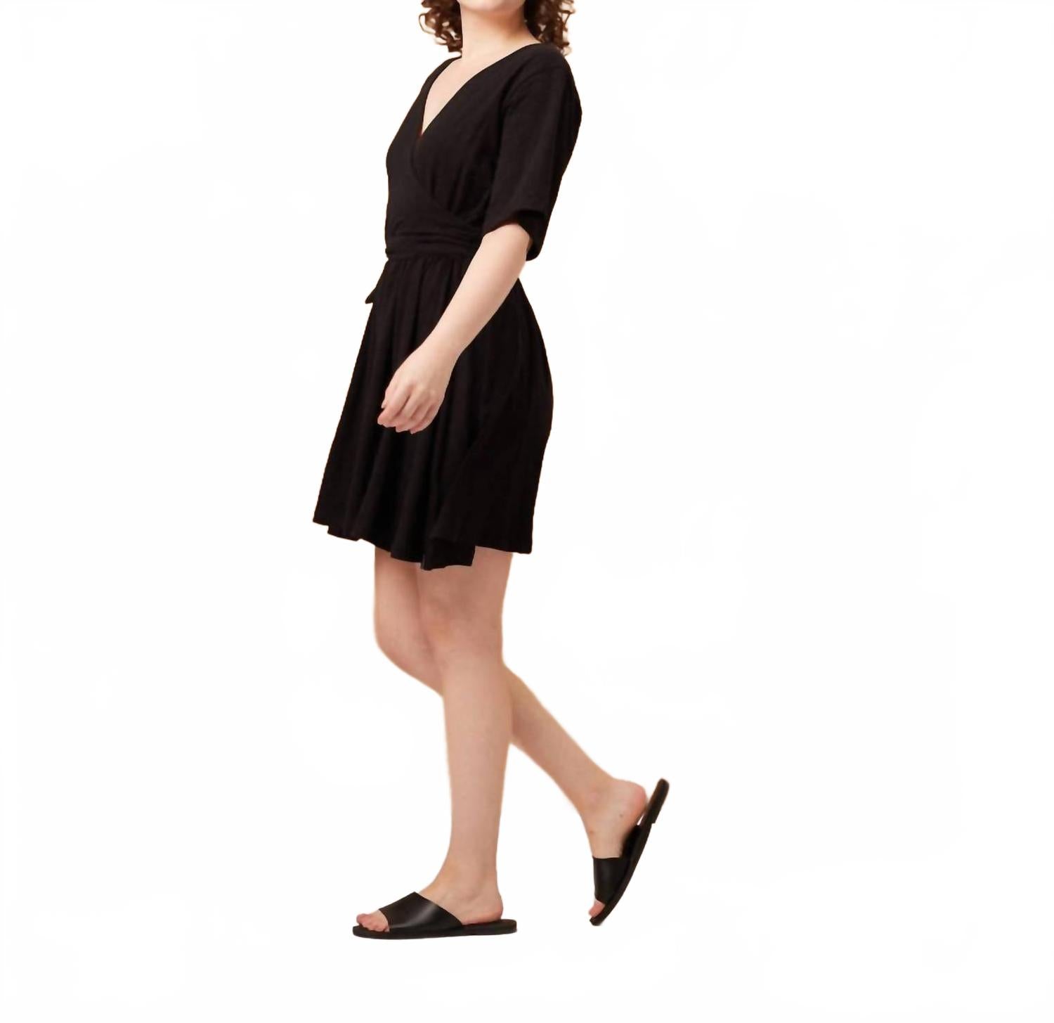 Идеальное мини-платье для теплых месяцев. Откройте для себя мини-платье Kalen от Known Supply - шикарное дополнение к вашему весеннему гардеробу. Это черное однотонное платье выполнено из 100% органического хлопка-слаба, сертифицированного GOTS, и идеально подходит для экологичных решений. Платье имеет V-образный вырез и рукава до локтя, а его А-образный силуэт дополнен практичной завязкой. Оцените очарование этого платья, сертифицированного Fair Trade, на любой праздничной вечеринке или пасхальном торжестве.