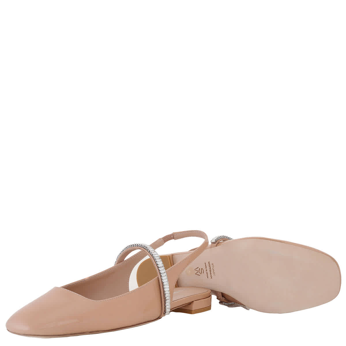 Женские балетки Stuart Weitzman. Цвет: Adobe/Clear. Балетки Stuart Weitzman Stefanie Patent с открытой спинкой. Балетки Stefanie изготовлены из телячьей кожи с лакированной отделкой, украшены кристаллами, имеют круглый носок, ремешок на пятке, одинарный ремешок на большом пальце, без застежки, фирменную кожаную стельку и плоскую кожаную подошву. Верхний материал: 100% лакированная телячья кожа. Сделано в Испании.