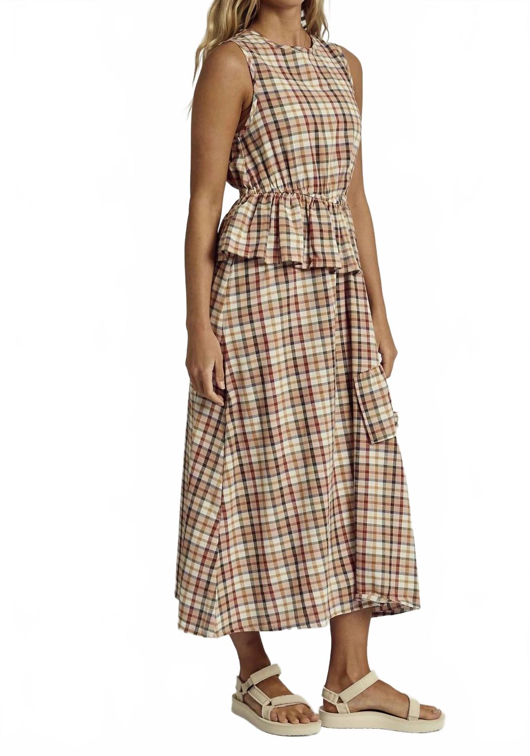 Платье миди настолько универсально, что варианты его ношения безграничны. Платье миди Ruffilo от Native Youth воплощает очарование весны благодаря клетчатому принту в пастельных коричневых тонах. Это платье без рукавов с широкими плечами и А-образным силуэтом дополнено игривым вырезом-бабочкой на спине. Изготовленное из 100% хлопка, оно обеспечивает дышащий комфорт и идеально подходит для вечеринок по случаю рождения ребенка и других весенних мероприятий. Примечание: Инструкции по стирке и сушке не указаны.