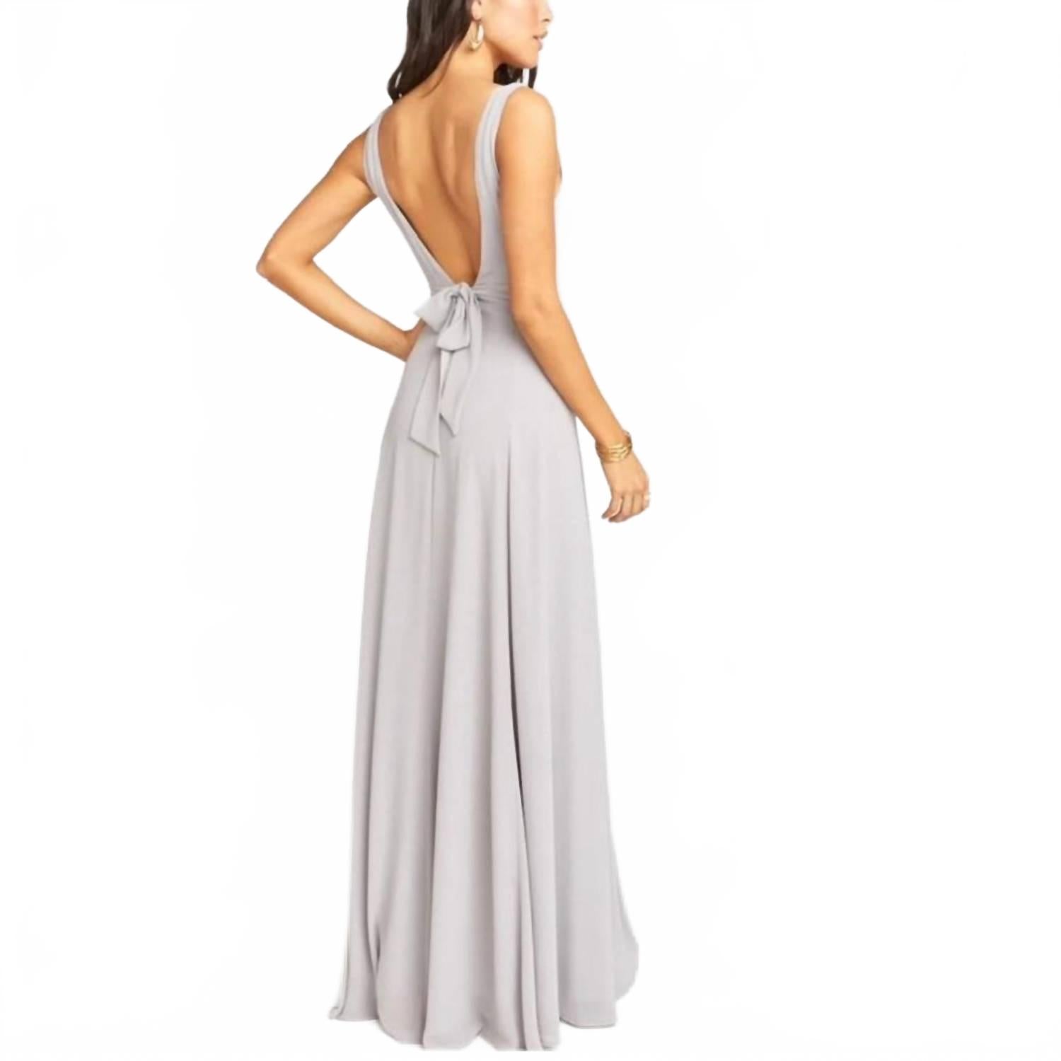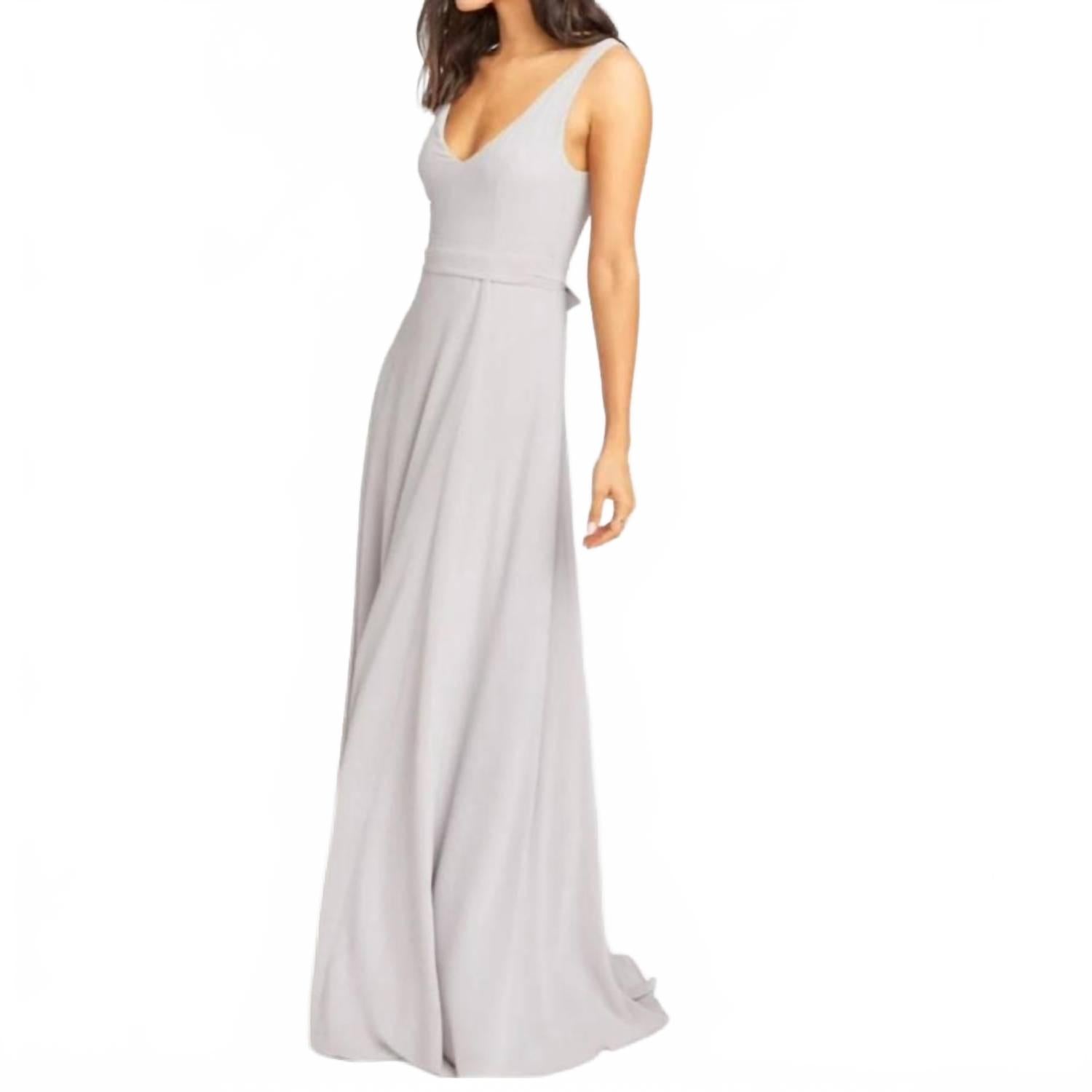 Платье макси Jenn от Show Me Your Mumu - потрясающее платье без рукавов, идеально подходящее для праздничных вечеринок. Это облегающее макси-платье из 100% полиэстерового шифона с V-образным вырезом и пышной юбкой А-силуэта, подчеркивающей фигуру. Элегантный серо-голубой оттенок дополняет застежка-молния сзади. Платье полностью на подкладке без разрезов. Съемный свадебный пояс добавляет нотку универсальности этому сплошному, вневременному изделию.