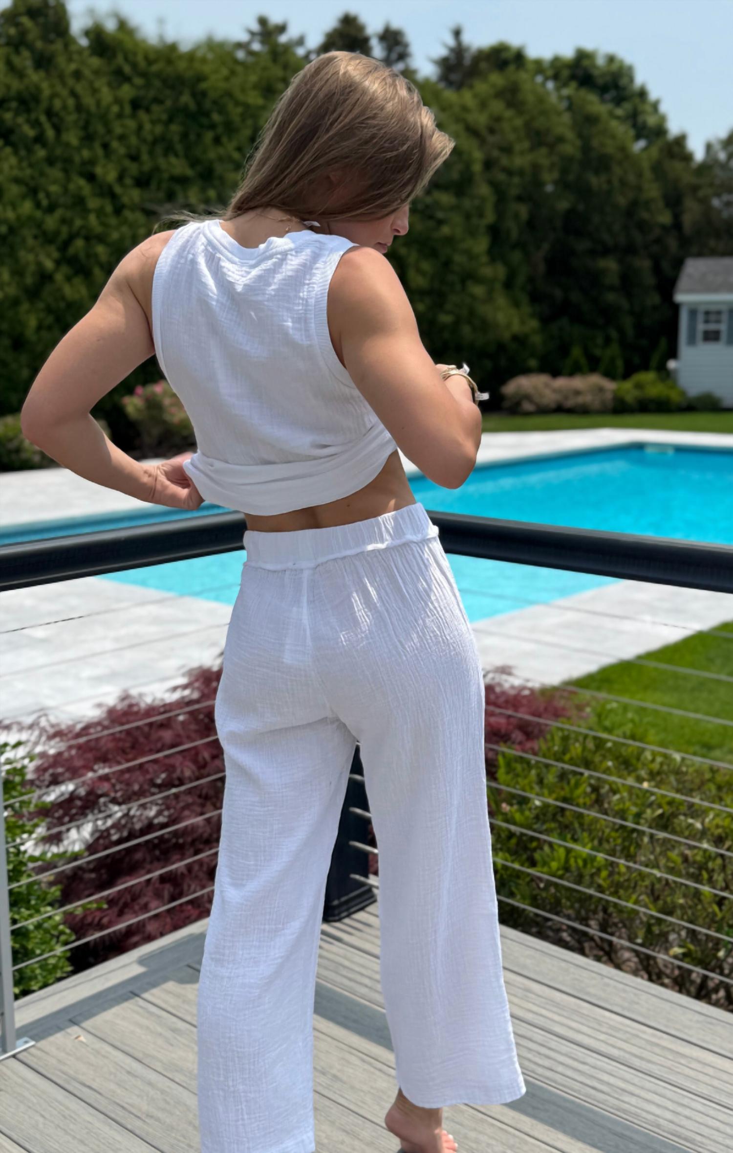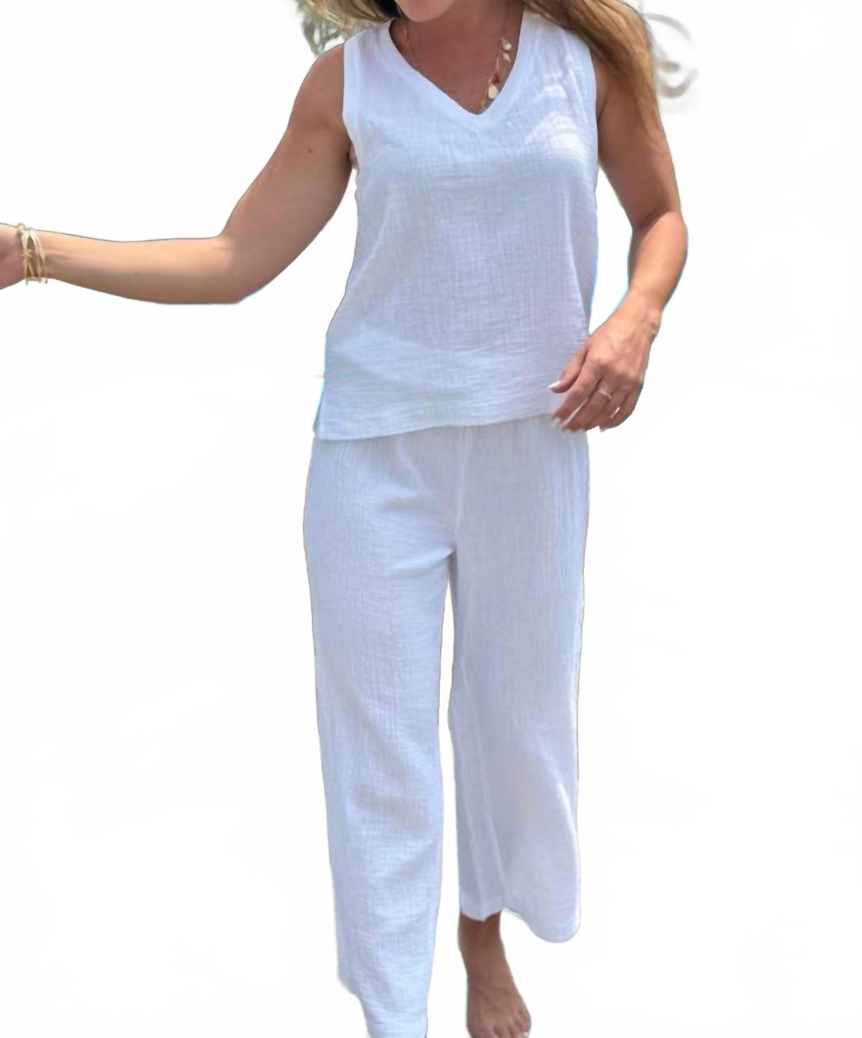 Посадка, ткань и функциональность. Эта майка отвечает всем требованиям. Откройте для себя майку Rib Mix с V-образным вырезом от bobi - незаменимый элемент летнего стиля. Эта майка без рукавов из 100% хлопковой марли обеспечивает свободную посадку и текстурную элегантность в однотонном белом цвете. Благодаря V-образному вырезу и длине до бедер она легко сочетается с джинсами или другими подходящими комплектами. Застежка: надевайте. Уход: ручная стирка и сушка в разложенном виде на горизонтальной поверхности.