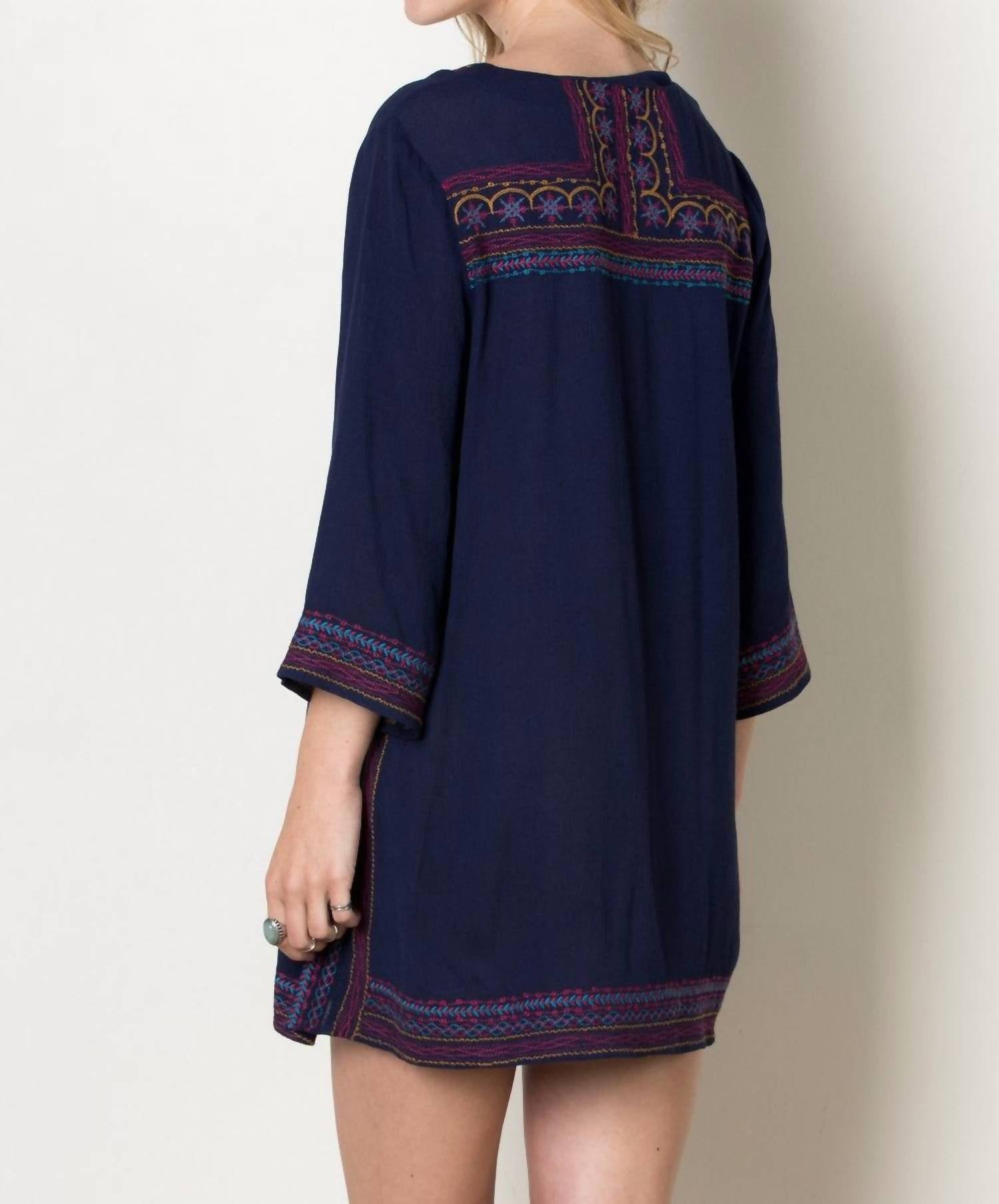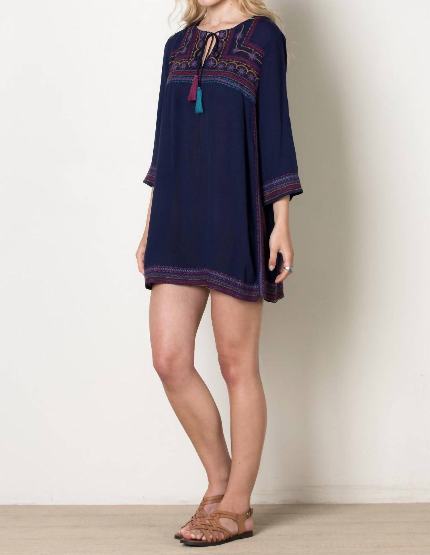 Свободное и элегантное платье, которое вы будете носить круглый год. Ощутите богемный шарм в платье-трапеции с вышивкой Gypsy Love от THML, которое подчеркнет вашу свободолюбивую натуру. Это темно-синее платье из мягкого вискозного шелка украшено яркой вышивкой, V-образным вырезом с завязками-кисточками и рукавами три четверти. А-образный мини-силуэт обеспечивает идеальную посадку. Размеры: обхват груди 34-40 дюймов, длина 30 дюймов. Застежка: завязка. Идеально подходит для игривой нотки в вашем гардеробе.