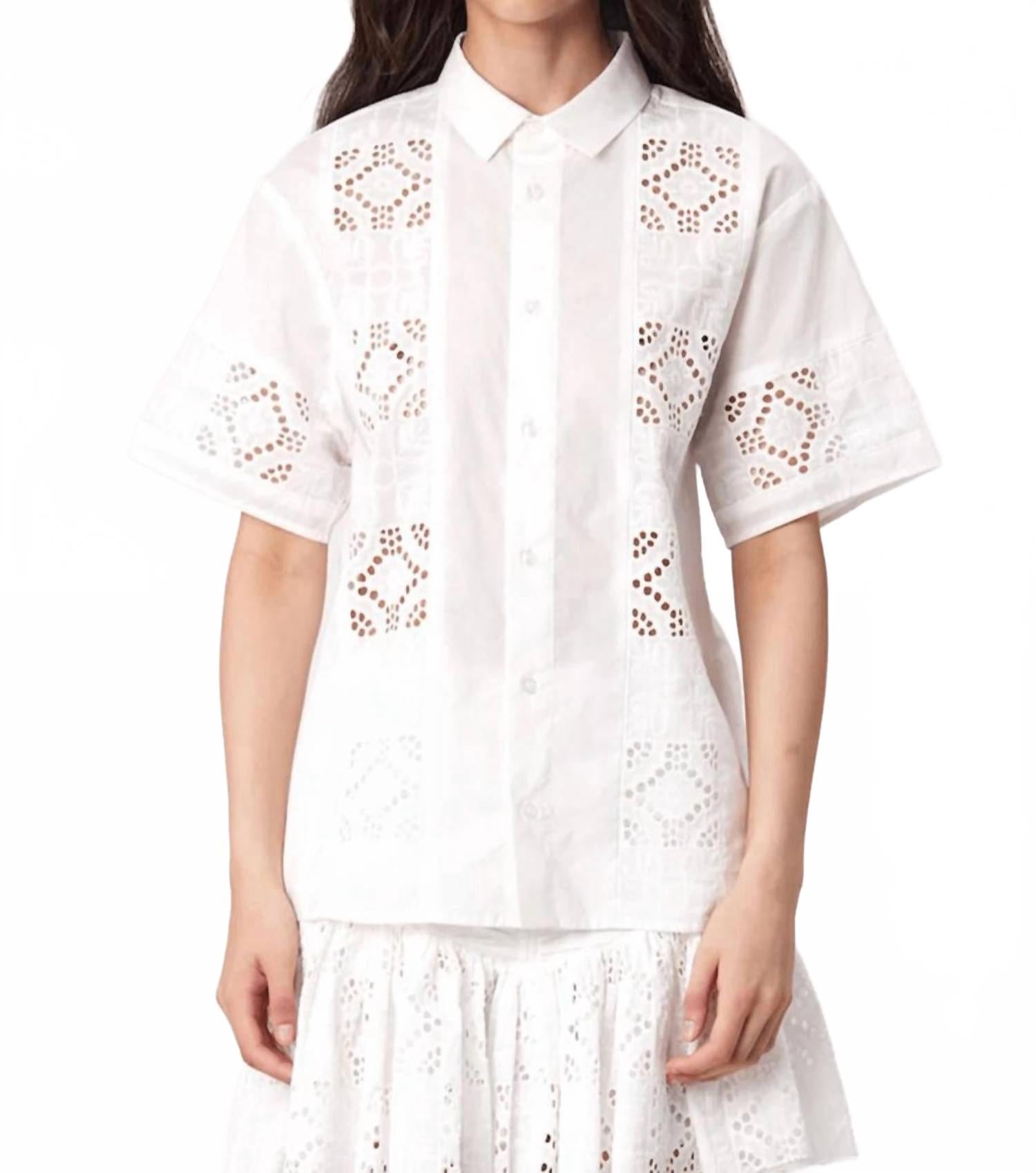 Рубашка Elsa от REMAIN - это красивая блузка с короткими рукавами из 100% легкого хлопка элегантного цвета слоновой кости. Изысканная вышивка с ажурными петлями добавляет текстуру, а структурированный воротник подчеркивает элегантный вид, легко сочетая классический стиль с легкой женственностью. Рубашка застегивается на пуговицы для удобства ношения и идеально подходит для лета и отпуска. Рекомендации по уходу: ручная стирка и сушка на веревке.
