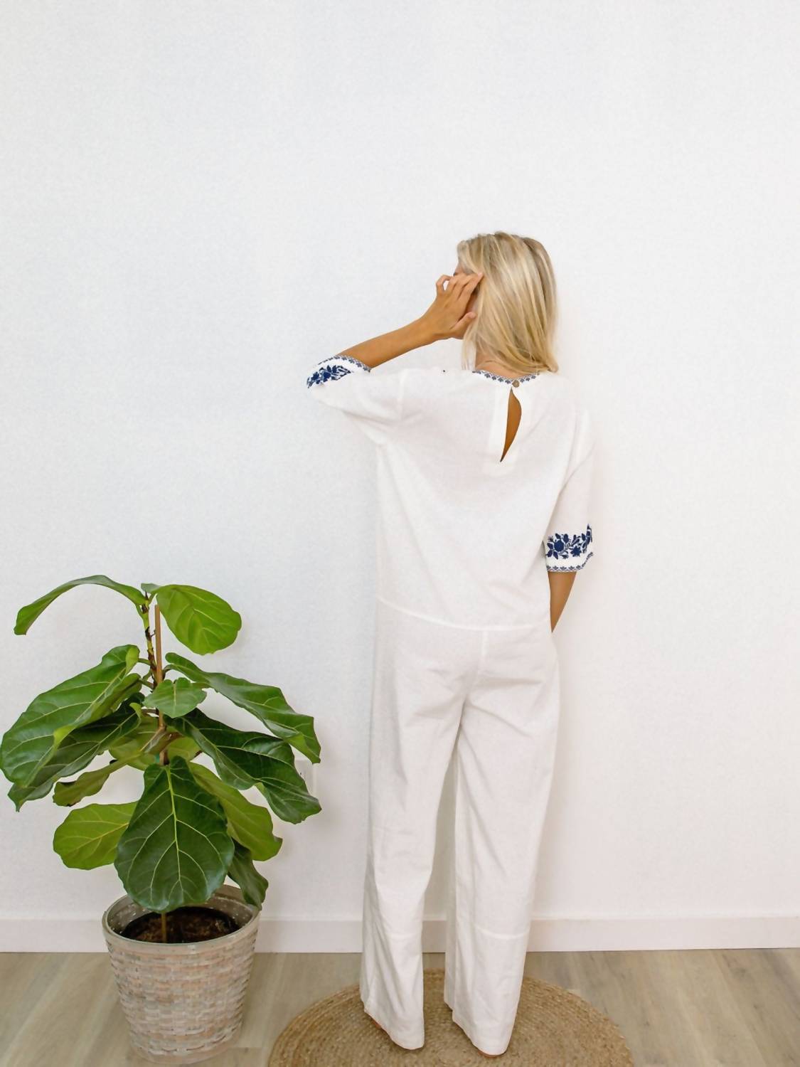 Этот комбинезон выглядит стильно и непринужденно, не нужно многого. Добавьте эффектные украшения, чтобы сделать его более нарядным, или наденьте кроссовки для более непринужденного образа. Представляем комбинезон Jetties от Эрики Уилсон - стильный и непринужденный вариант для любого случая. Этот белый комбинезон с цветочным узором и синей вышивкой добавляет нотку элегантности. Практичные карманы и удобная застежка на пуговицы идеально подходят для создания стильного образа на ходу. Уход: только химчистка.