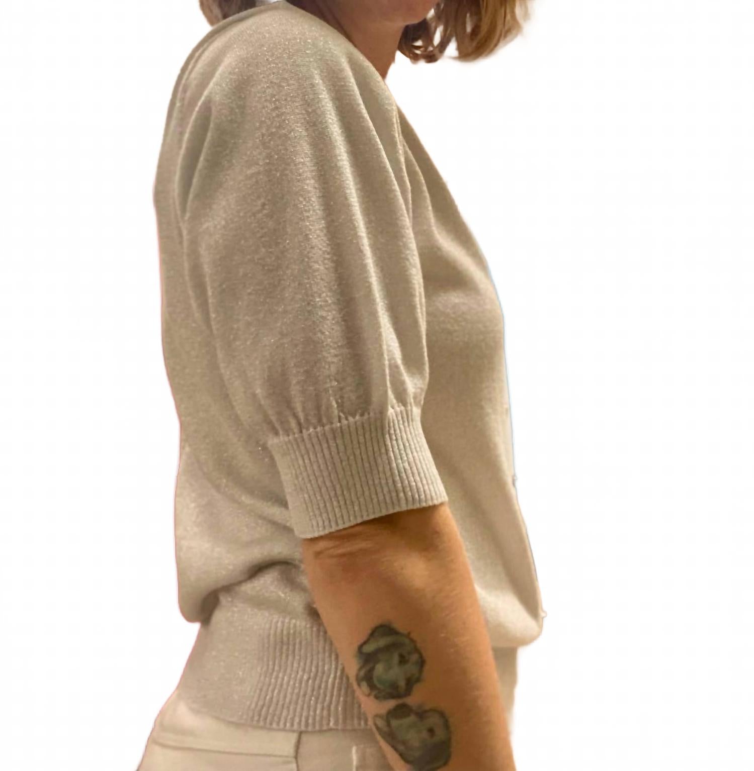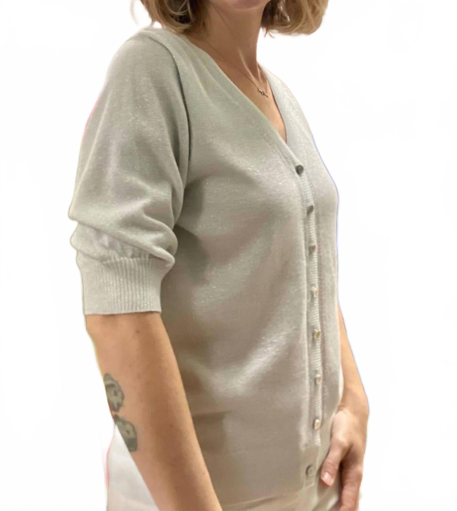 Накиньте этот очаровательный кардиган поверх любой майки или топа. Представляем двусторонний кардиган Sparkle от Marble - универсальный выбор для любого случая благодаря стильному V-образному вырезу. Этот бежевый кардиган с короткими рукавами можно носить задом наперед, создавая уникальный образ. Изготовлен из хлопковой смеси (75% хлопка, 16% полиэстера и 9% металлизированного волокна), что обеспечивает комфортную посадку. Застежка: пуговицы. Уход: ткань предварительно усажена и не требует особого ухода.