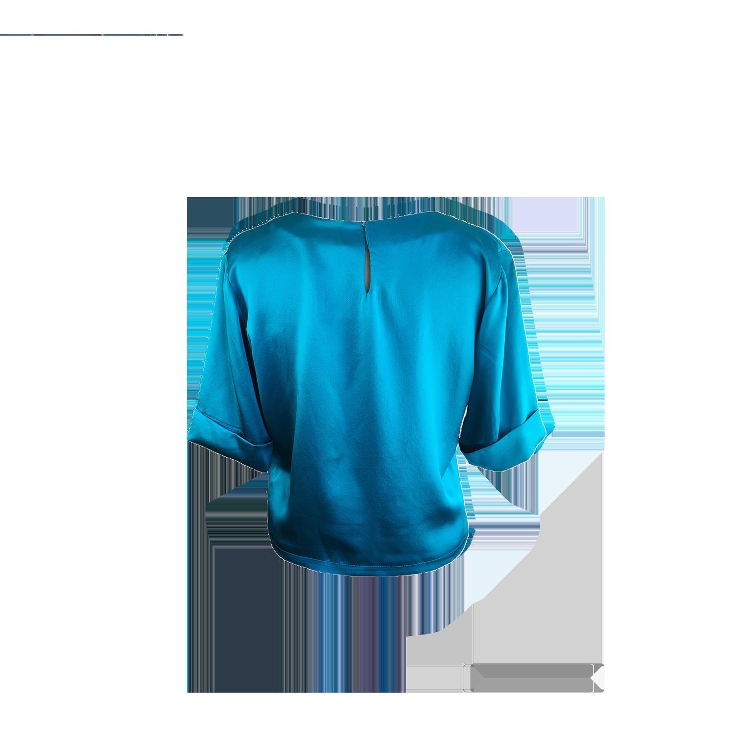 Блузка, которая никогда не выйдет из моды. Откройте для себя женский топ The Nami от Heike-NY - шикарное дополнение к вашему гардеробу в ярком бирюзовом цвете. Этот однотонный топ с короткими рукавами, выполненный из 100% шелкового шармеза, дарит роскошный вид и обладает укороченным свободным силуэтом, который создает современный образ. Изготовленный в Нью-Йорке, он имеет классический круглый вырез и удобную застежку-липучку. Идеально подходит для летних случаев, легко превращаясь из дневного в вечерний.