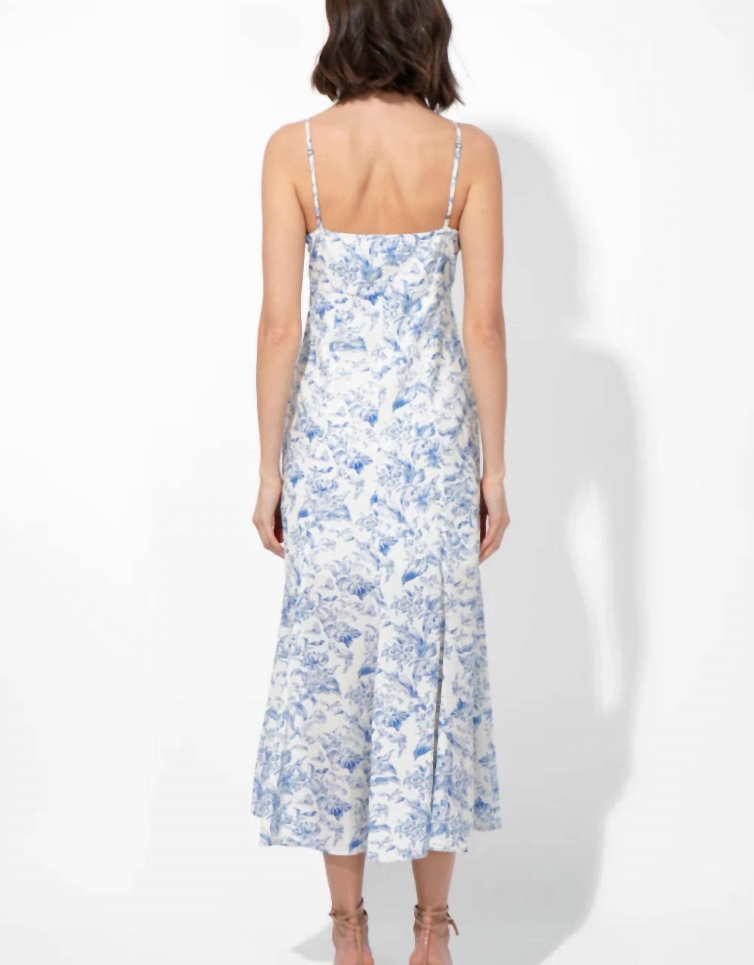 Очаровательное платье в бело-синих тонах, воплощающее бохо-шик благодаря своему цветочному узору. Платье миди А-силуэта с регулируемыми тонкими бретельками и удобной застежкой-молнией сбоку обеспечивает идеальную посадку. Изготовлено из 100% хлопка с подкладкой из полиэстера. Платье легко скользит по фигуре. Стирайте это платье вручную. Оно идеально подходит для элегантного весеннего ужина или празднования Дня благодарения.