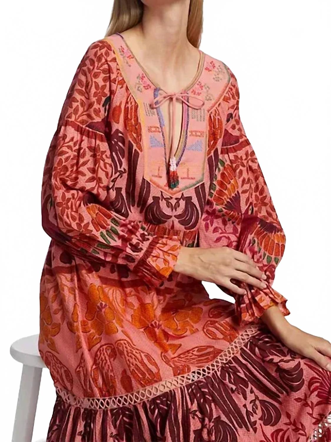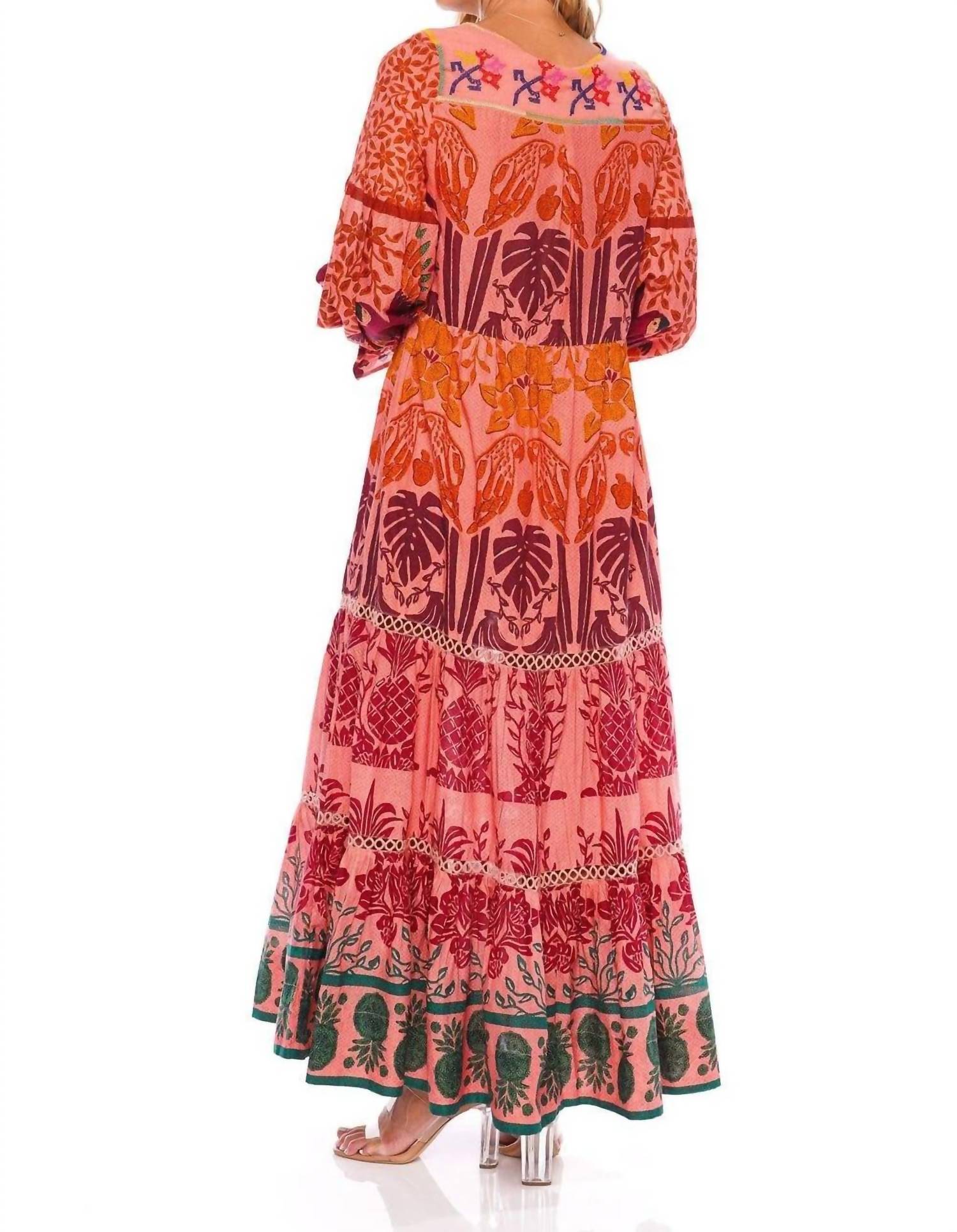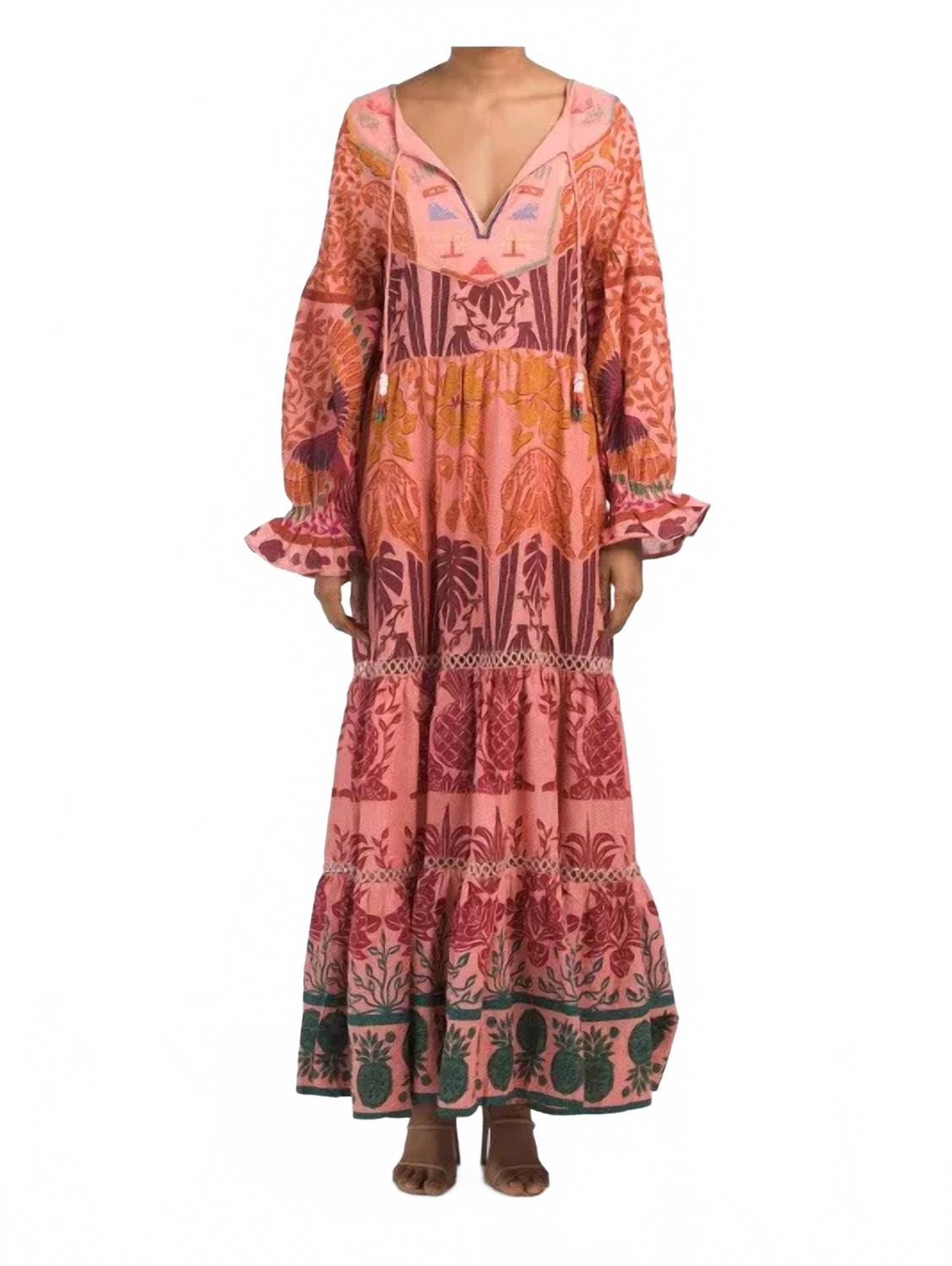 Ощутите яркий летний стиль в платье макси FARM RIO Ainika Print Macaws, сочетающем в себе принты в игривой многоцветной палитре. Это элегантное изделие имеет длинные рукава-фонарики и V-образный вырез с разрезом, украшенным завязкой с кисточками и вышивкой. Платье макси из смеси хлопка, льна и вискозы легко стирать в стиральной машине. Длина изделия - 143 см от плеча до подола. Застежка на завязку.