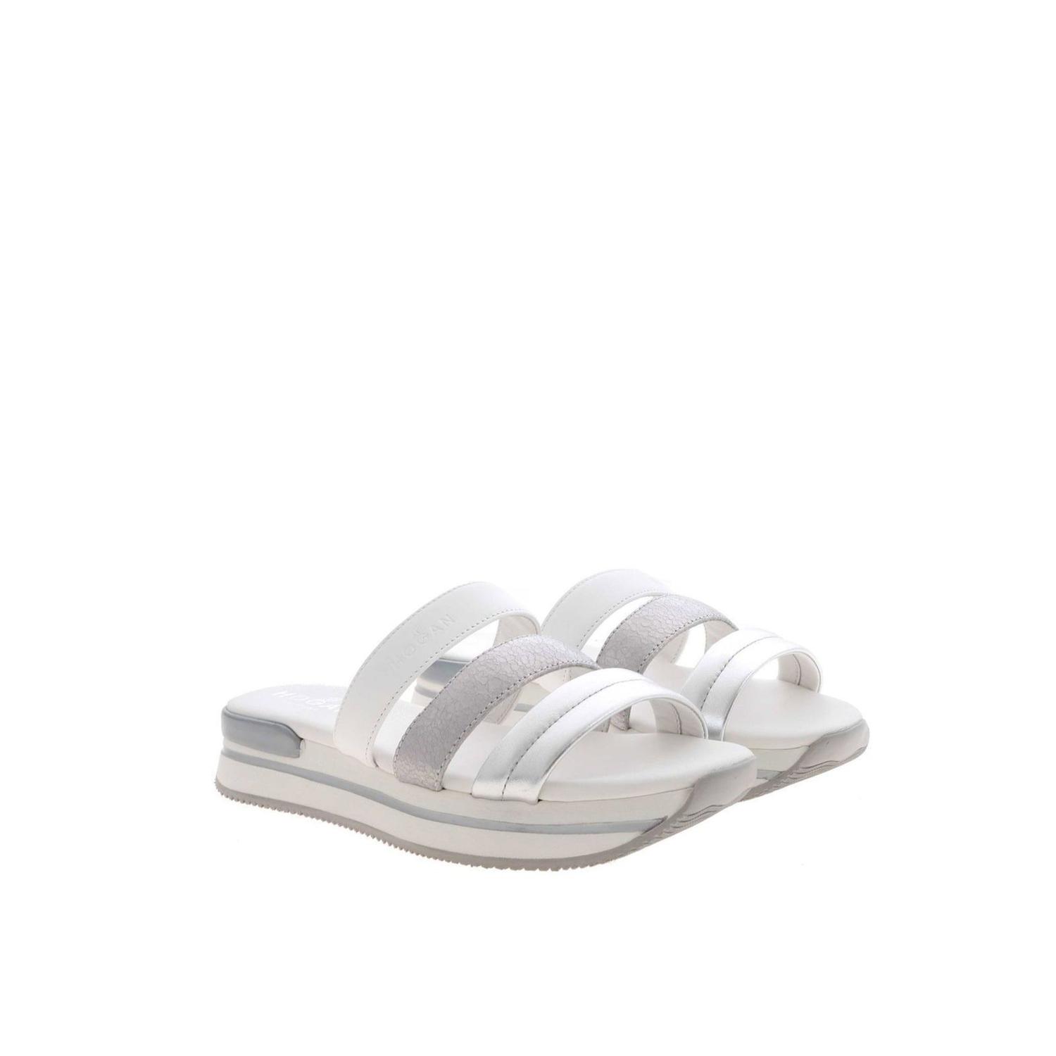 Сандалии Hogan H257 изготовлены из белой и серебристой телячьей кожи и отличаются плоским дизайном. Эти сандалии сочетают в себе строгую цветовую палитру и элегантный силуэт, предлагая стильный и удобный выбор для самых разных случаев.