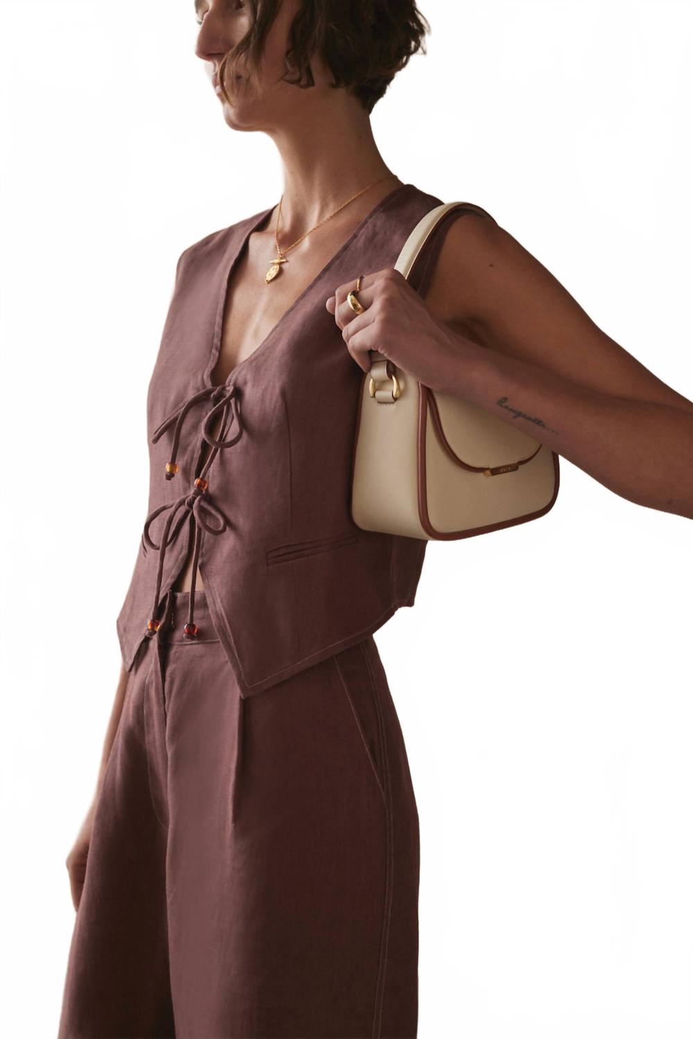 Ощутите вневременную элегантность жилета Sancia Drita насыщенного коричного оттенка. Эта модель без рукавов, выполненная из плотного дышащего льна, имеет приталенный крой, стильную завязку спереди и контрастную строчку, которая добавит изюминку любому образу. Жилет также дополнен практичными прорезными карманами спереди, которые обеспечивают функциональность и стильный вид. Уход: машинная стирка. 100% вискоза.