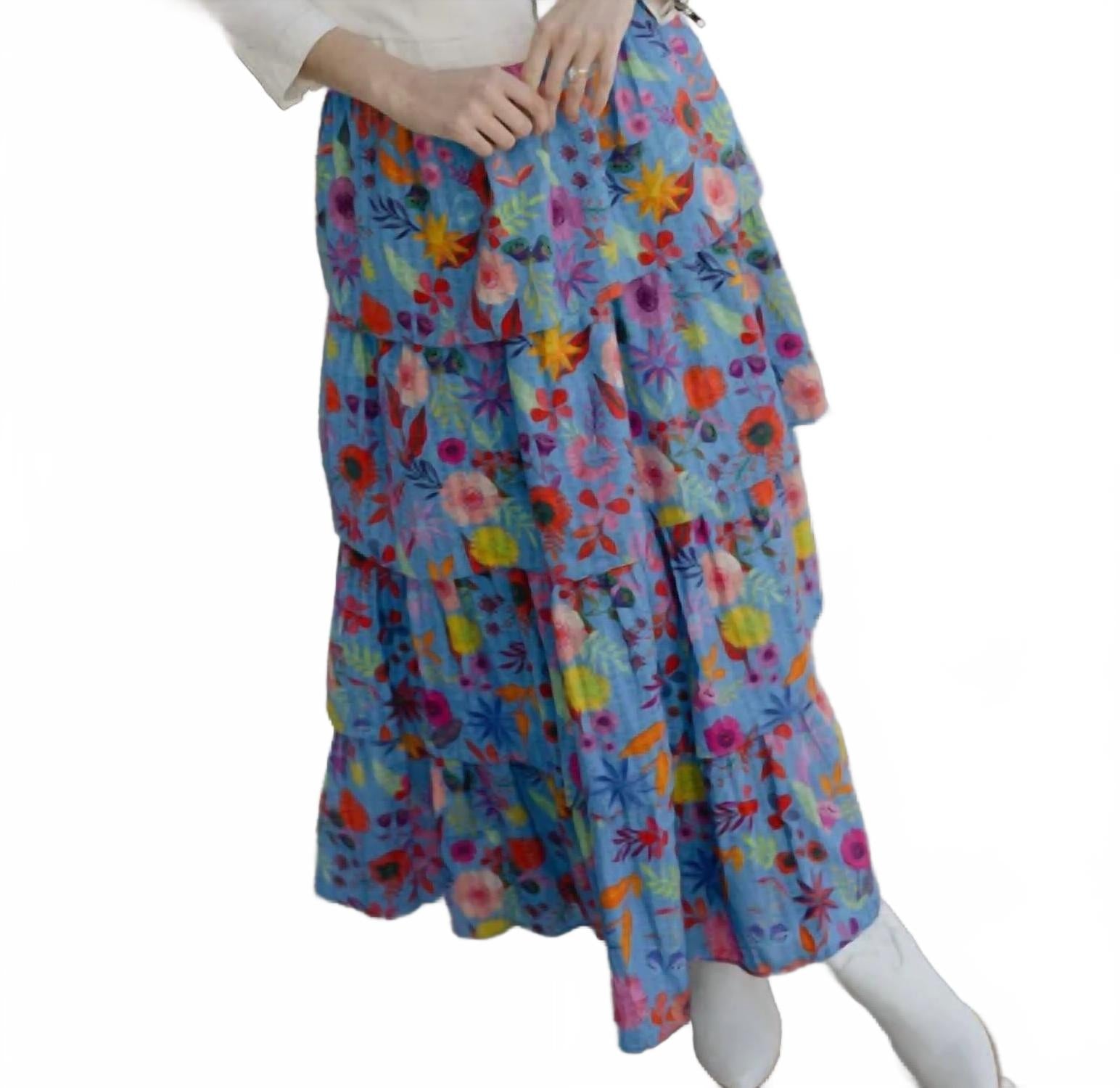 Эта асимметричная юбка станет отличным дополнением к вашему летнему образу - от рабочего стола до ужина. Юбка Aria от BRITON COURT станет прекрасным дополнением к вашему гардеробу. Эта асимметричная юбка синего цвета с цветочным принтом изготовлена ​​из 100% хлопка, обеспечивает комфорт и воздухопроницаемость. Игривый многоярусный крой и стильный пояс на талии создают соблазнительный и кокетливый образ. Застежка: надевайте. Уход: машинная стирка в холодной воде, сушить на вешалке. На модели размер XS.