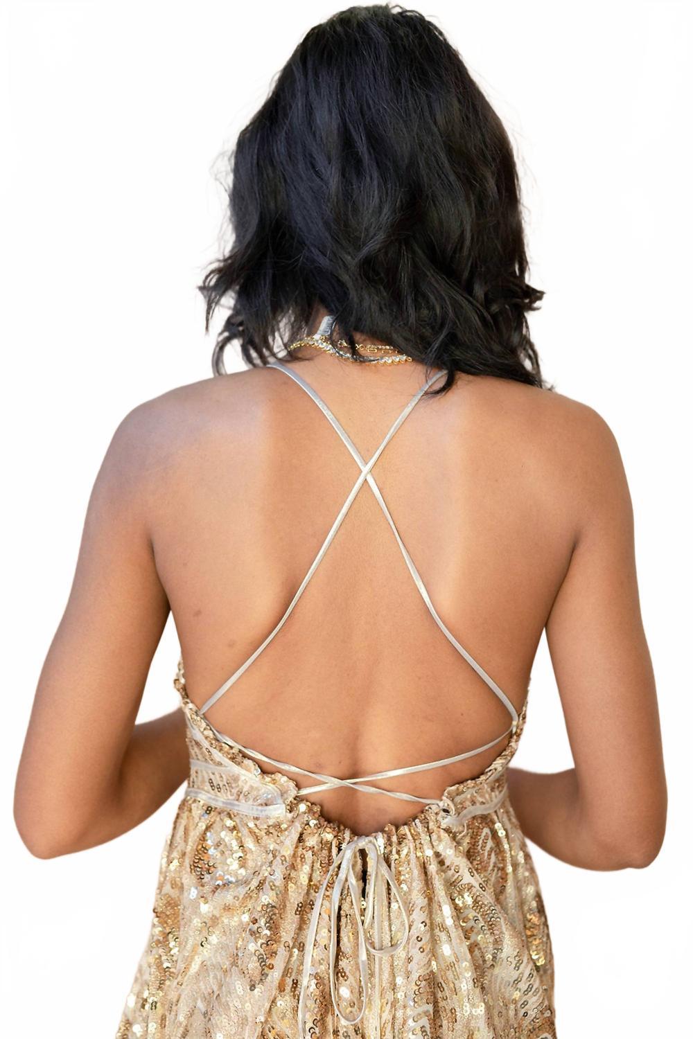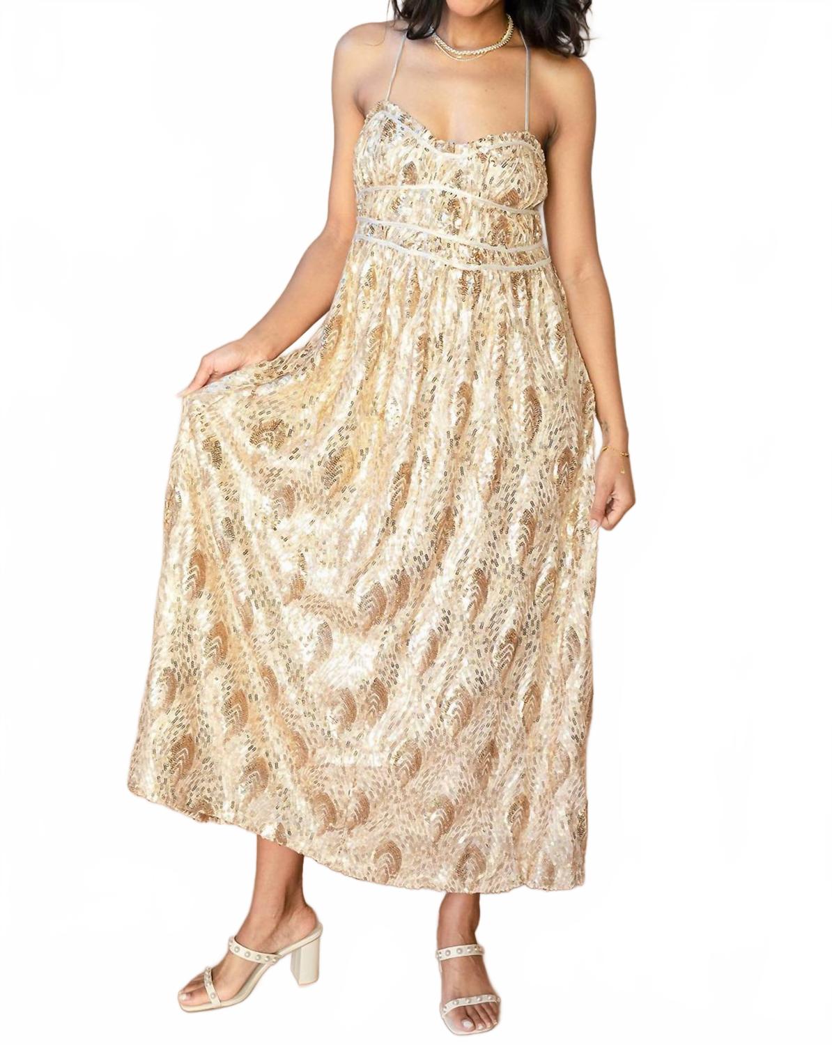 Платье идеальной длины существует. Создайте блистательный образ в платье миди Gianna от Sofie the Label, которое блистает на любой праздничной вечеринке. Это потрясающее золотистое платье с тонкими бретельками и геометрической отделкой из пайеток создает эффектный образ в стиле бохо-шик. Платье облегающего силуэта с расклешенной юбкой дополнено регулируемой шнуровкой на спине для индивидуальной завязки. Страна происхождения не указана, но для сохранения ослепительного вида рекомендуется ручная стирка.