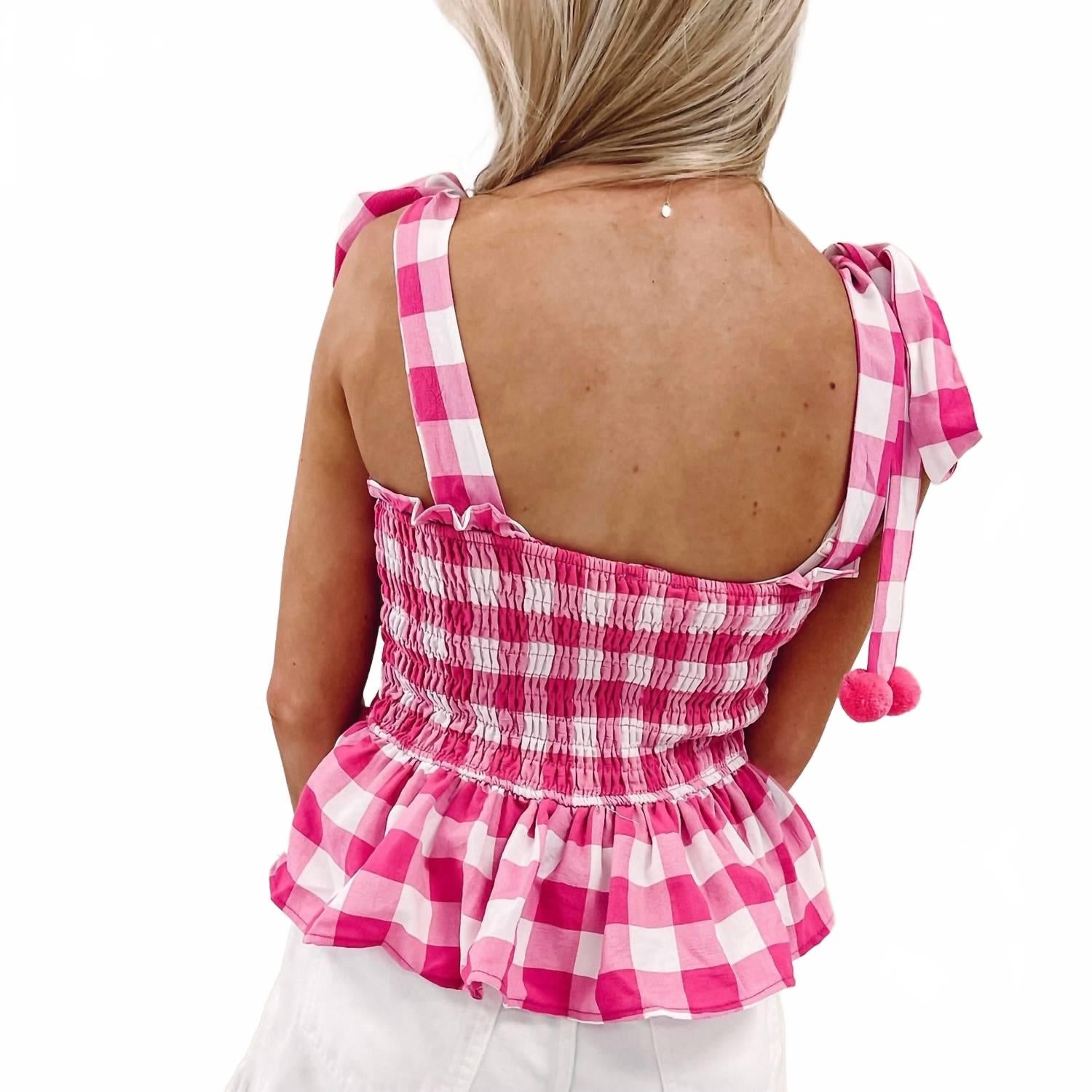 Погрузитесь в непринужденный летний стиль с топом Be Here With Me от TCEC с игривым клетчатым узором в пурпурно-белых тонах. Эта безрукавка с регулируемыми завязками на рукавах, очаровательной отделкой в виде подушечек и оборкой по подолу. Изготовленная вручную из смеси 98% полиэстера и 2% спандекса, она обеспечивает комфорт и стиль. Особенности кроя: рост модели 160 см, размер S. Застежка: завязка. Идеально подходит для образов в отпуске в стиле 90-х.