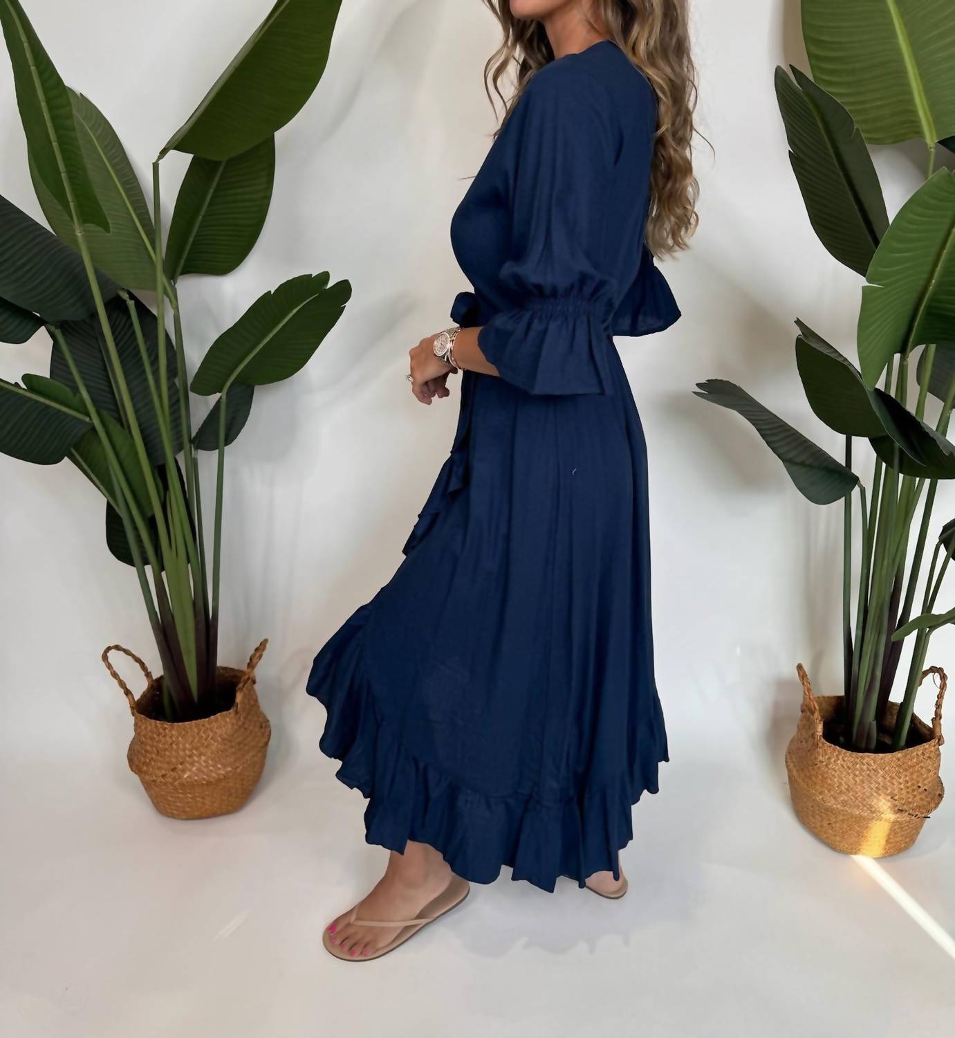 Платье макси, столь же милое, сколь и удобное. Откройте для себя непринужденную элегантность платья макси Sole Tatiana цвета индиго, созданного для создания струящегося силуэта. Это платье А-силуэта украшено очаровательными оборками на рукавах до локтя и оборкой по низу, а также эффектным запахом и завязкой на талии. Изготовлено вручную в Индонезии из 100% хлопка - это роскошь, которой вы можете гордиться. Застежка: надевать. Уход: ручная стирка в холодной воде. Рост модели Алисса - 175 см, размер S.