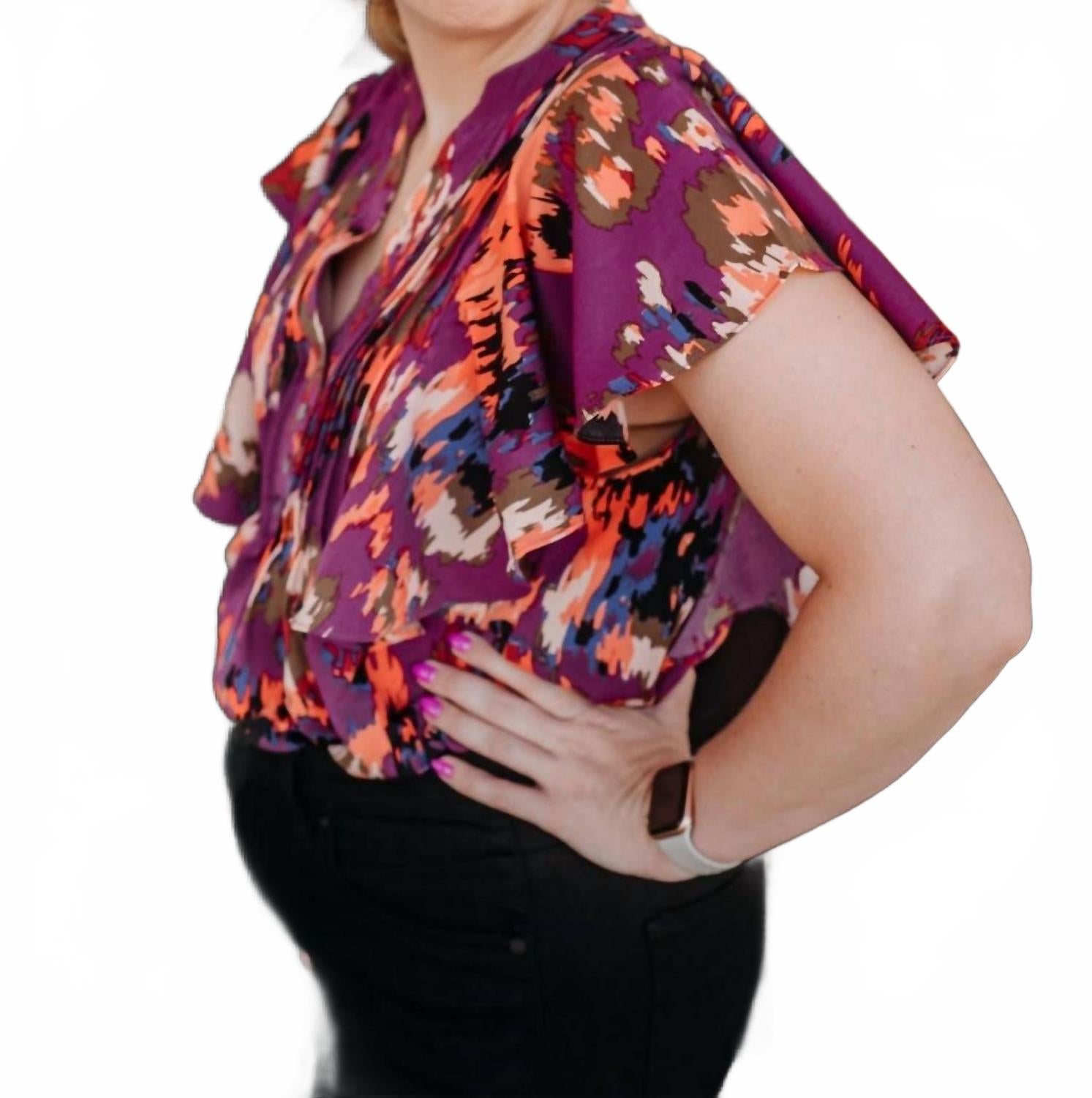 Универсальная блузка, которая подойдет как для работы, так и для ужина! Украсьте свой офисный гардероб блузкой с рукавами-оборками сливового цвета от Entro - очаровательной вещью, идеально подходящей для любого сезона. Верх с цветочным узором и ярким красным оттенком дополнен короткими рукавами-оборками, которые добавят очарования любому образу. Ее легко сочетать с джинсами или брюками, что делает ее универсальным вариантом для любых случаев. Застежка на пуговицы. Инструкции по уходу пока недоступны.